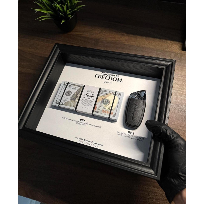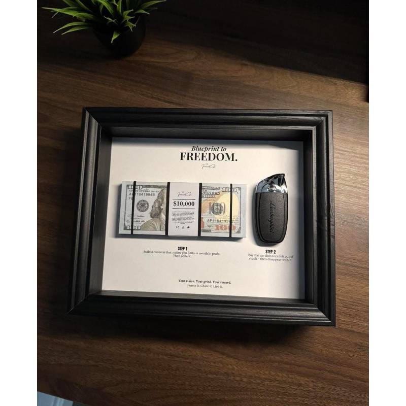 Blueprint to Freedom Frame by FramedCash | Lamborghini Key + 10K Dollar Stack | 25x20cm | Motivational Wall Art home decor.