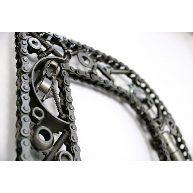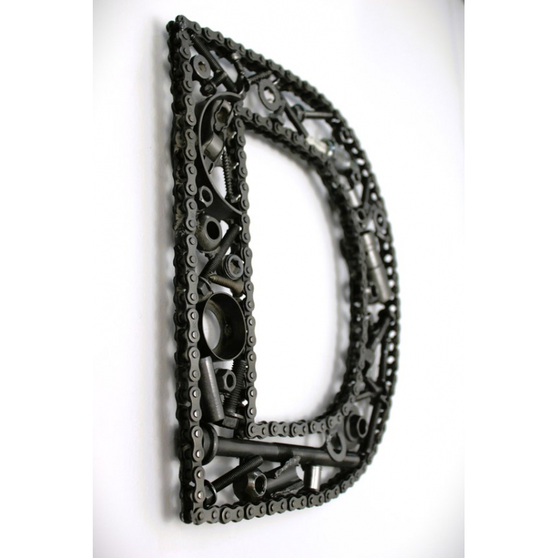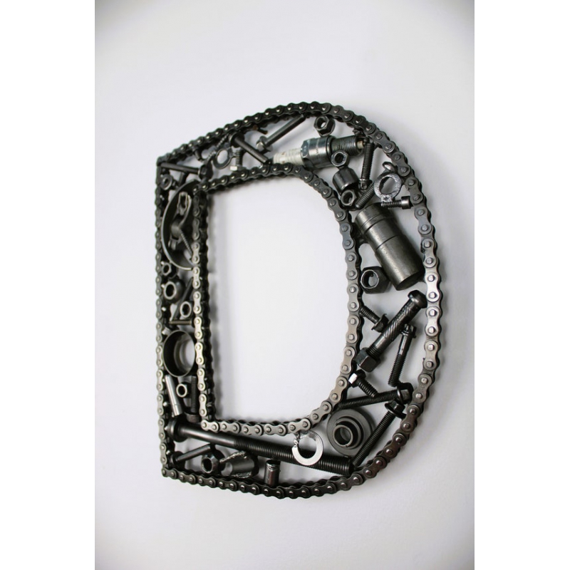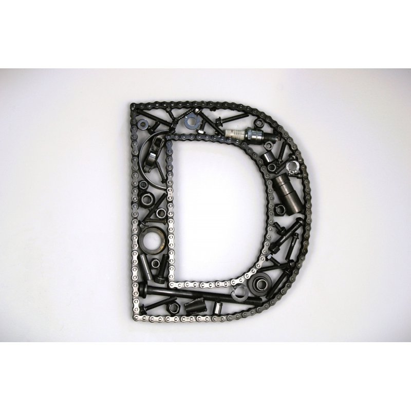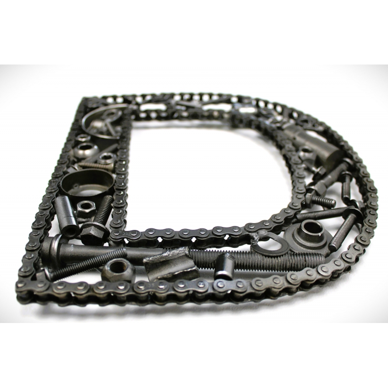 We begin the process by drawing out the letter on our welding table, and then using a timing chain to create the perimeter. After that, a variety of parts are welded together to complete the piece.