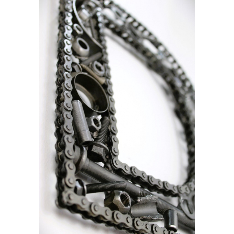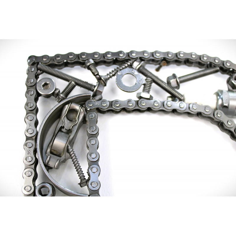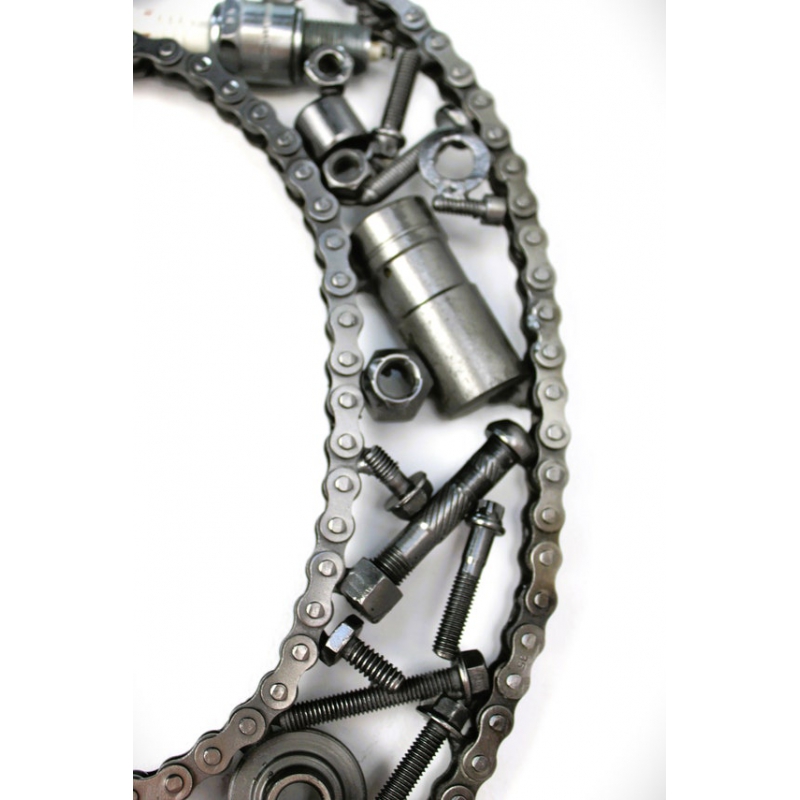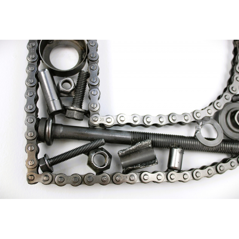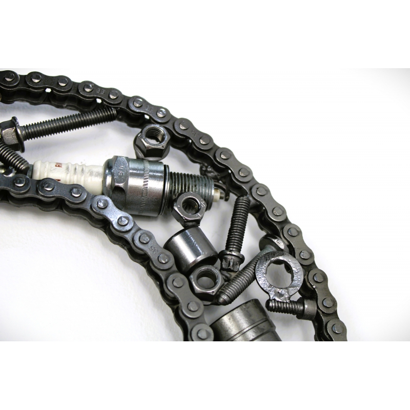We begin the process by drawing out the letter on our welding table, and then using a timing chain to create the perimeter. After that, a variety of parts are welded together to complete the piece.