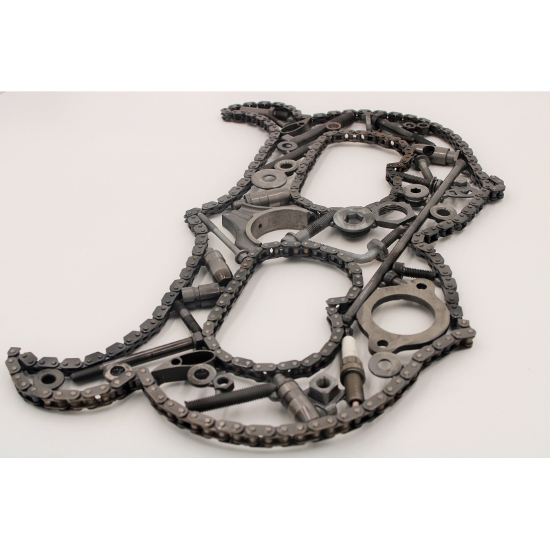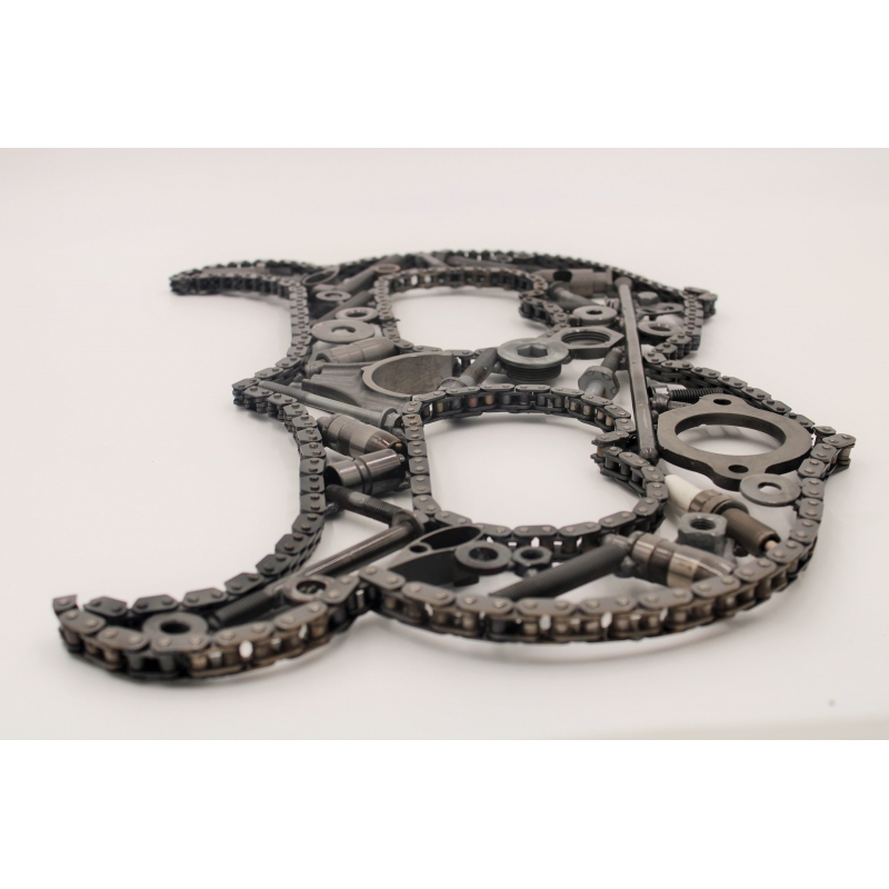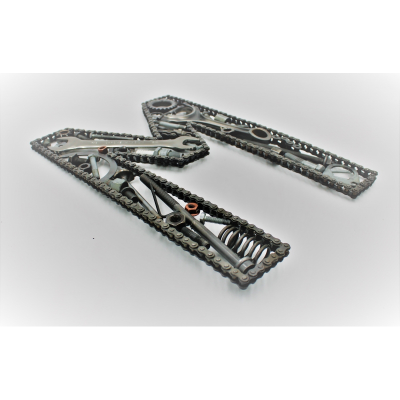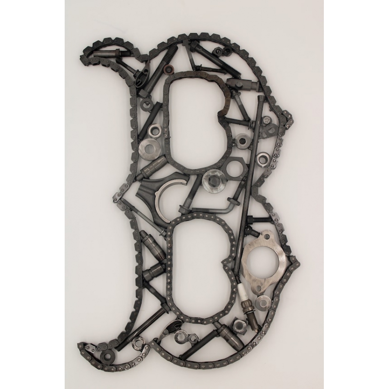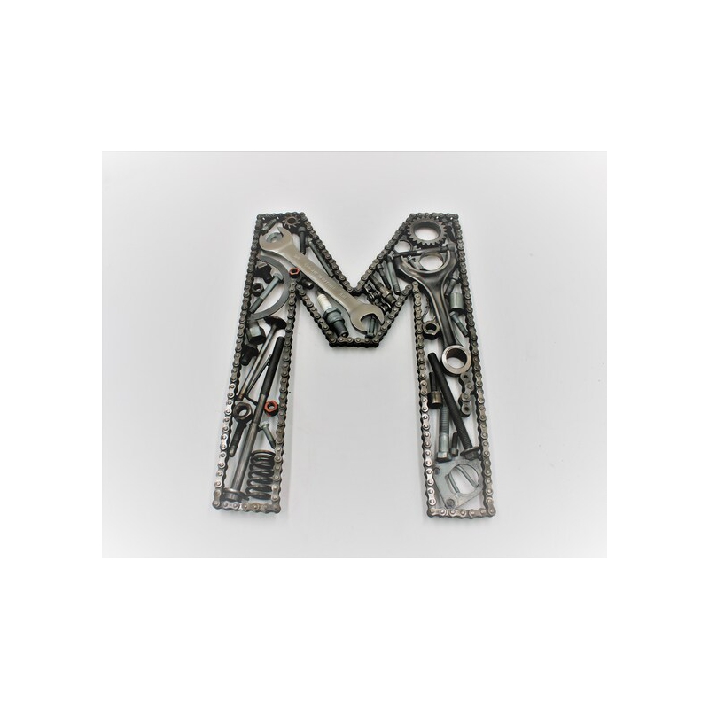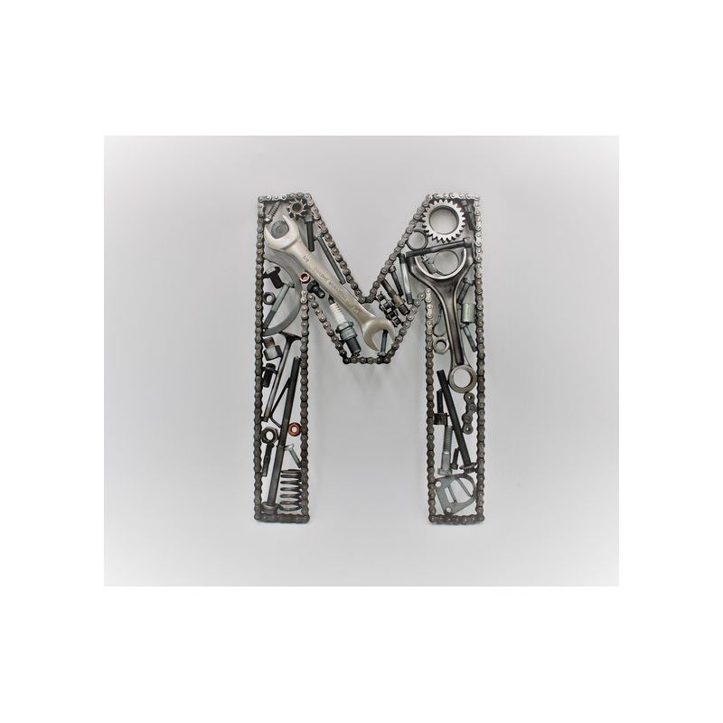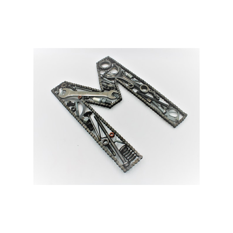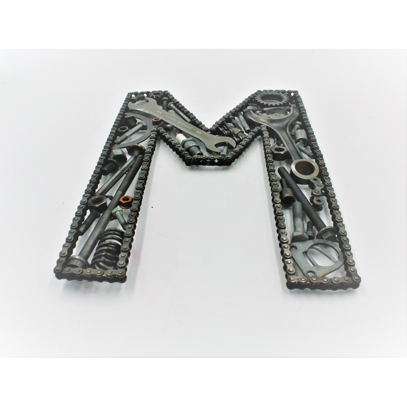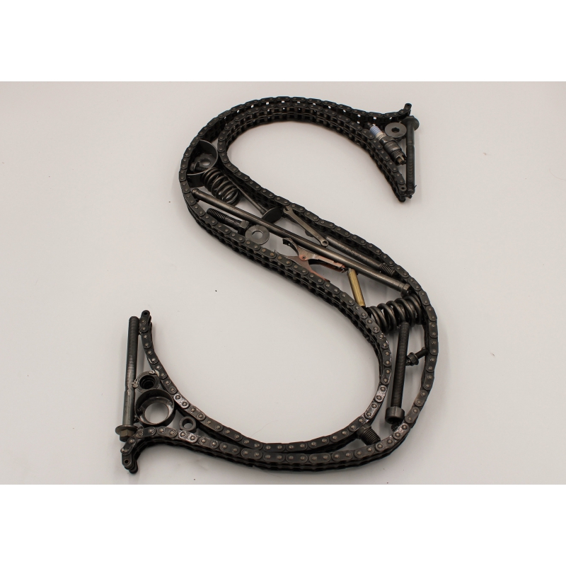 We begin the process by drawing out the letter on our welding table, and then using a timing chain to create the perimeter. After that, a variety of parts are welded together to complete the piece.