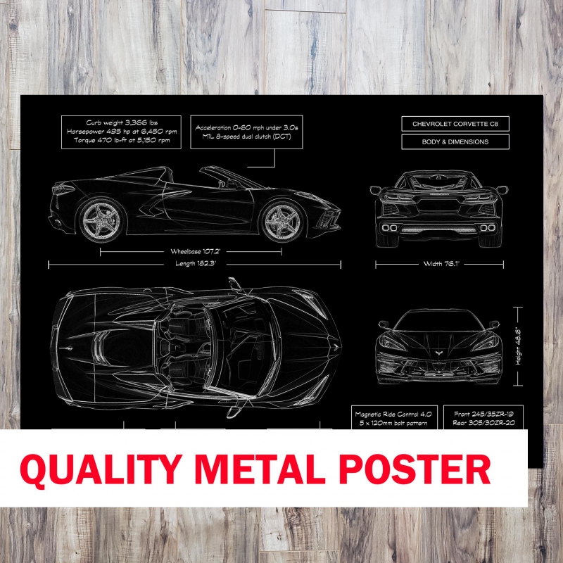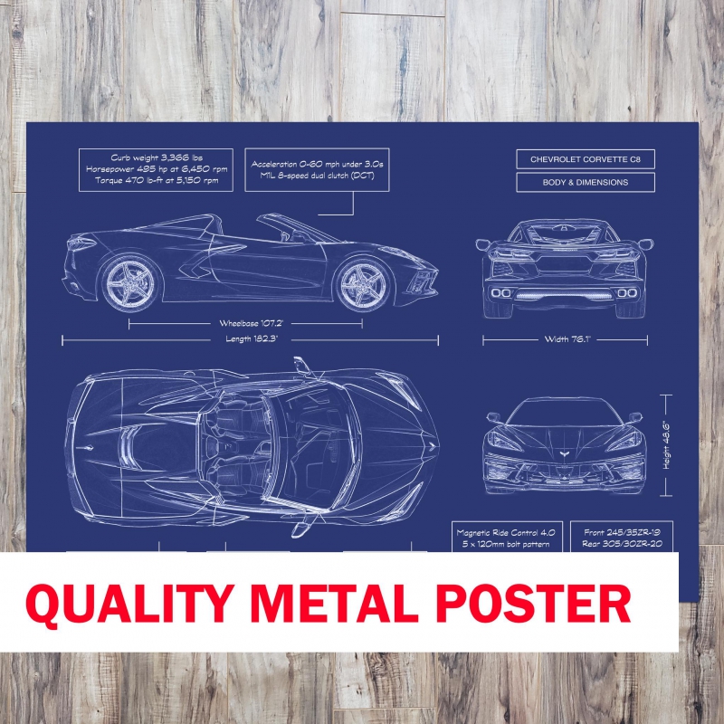 Some admire art. Others admire horsepower. This precision-crafted metal wall poster celebrates the 2020–2024 Chevrolet Corvette C8 Convertible — a masterpiece of American engineering and design. Printed on durable brushed metal with a sleek matte finish, it captures every line and detail of the C8 Convertible blueprint, transforming engineering into stunning wall art.