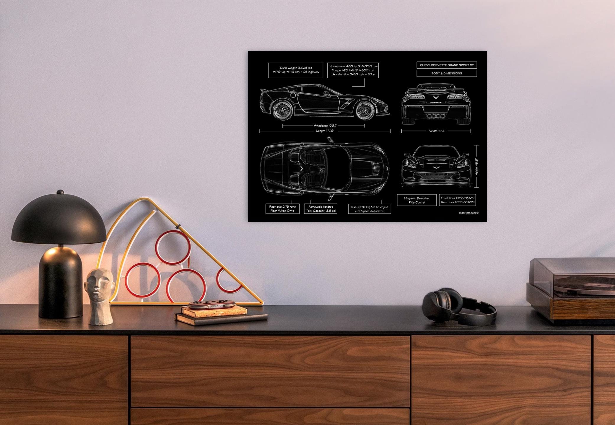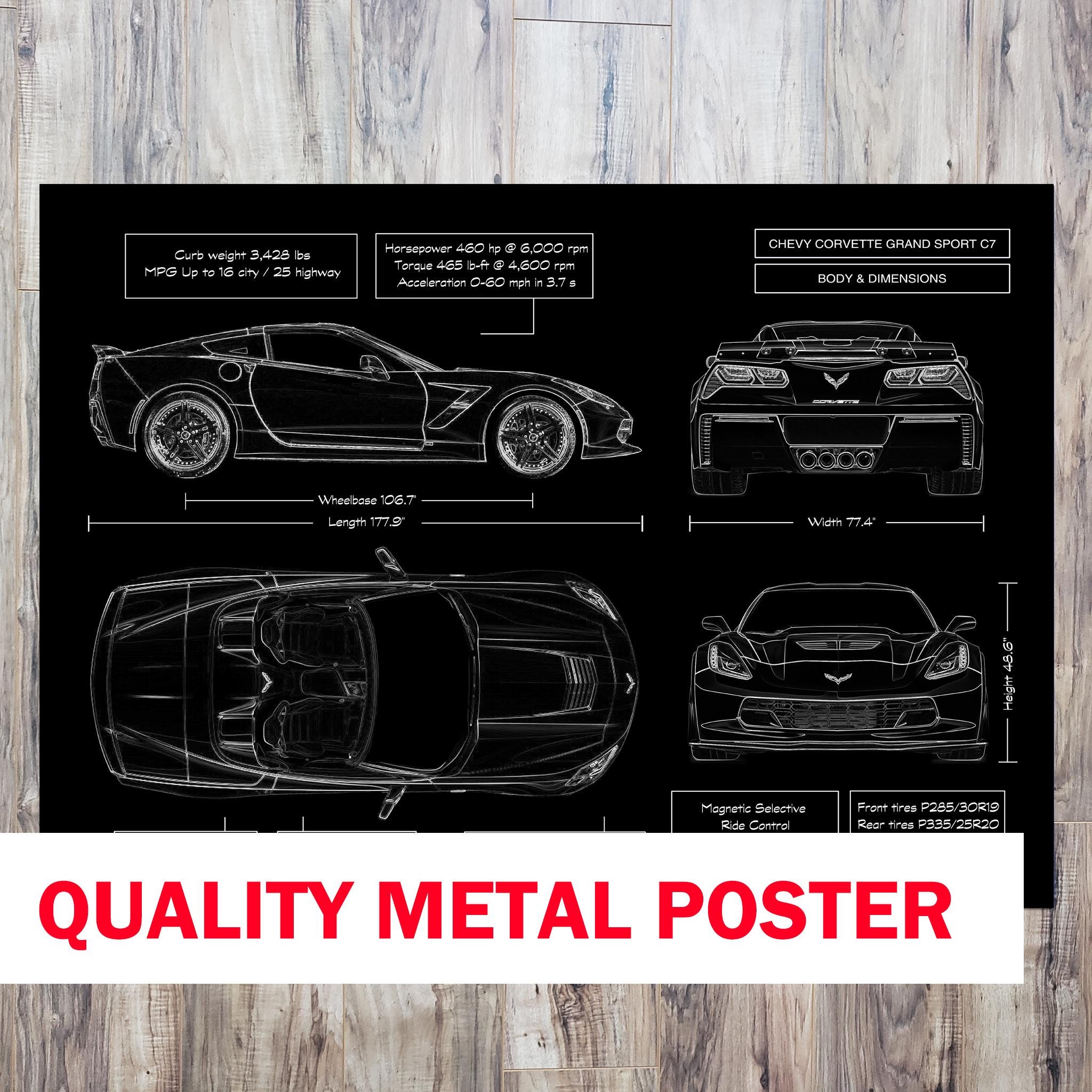 Celebrate the 2014–2019 Chevrolet Corvette C7 Grand Sport with a bold, precision-crafted metal wall poster. Printed on durable brushed metal with a sleek matte finish, this artwork highlights every contour and engineering detail of the C7 Grand Sport blueprint, turning iconic automotive design into an attention-grabbing display.