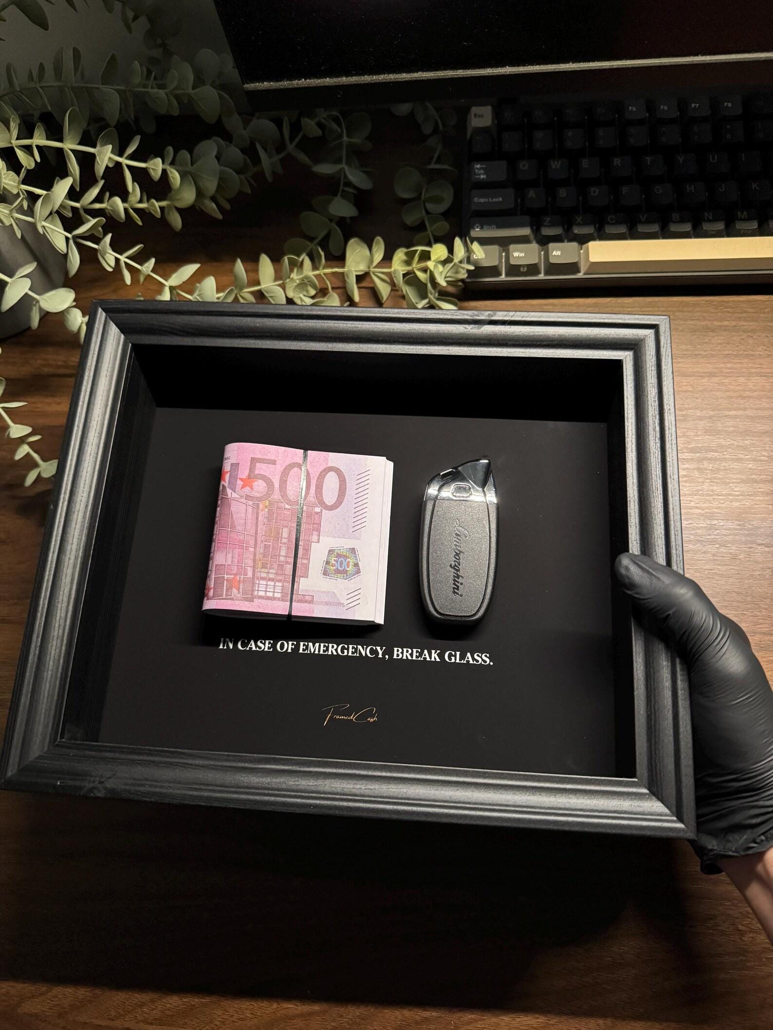This 25x20 cm handmade frame by FramedCash pairs a stack of €500 Euro notes with a Lamborghini key, mounted on a deep black backdrop. A sleek, luxury display that speaks to ambition, wealth, and the discipline it takes to reach the next level.