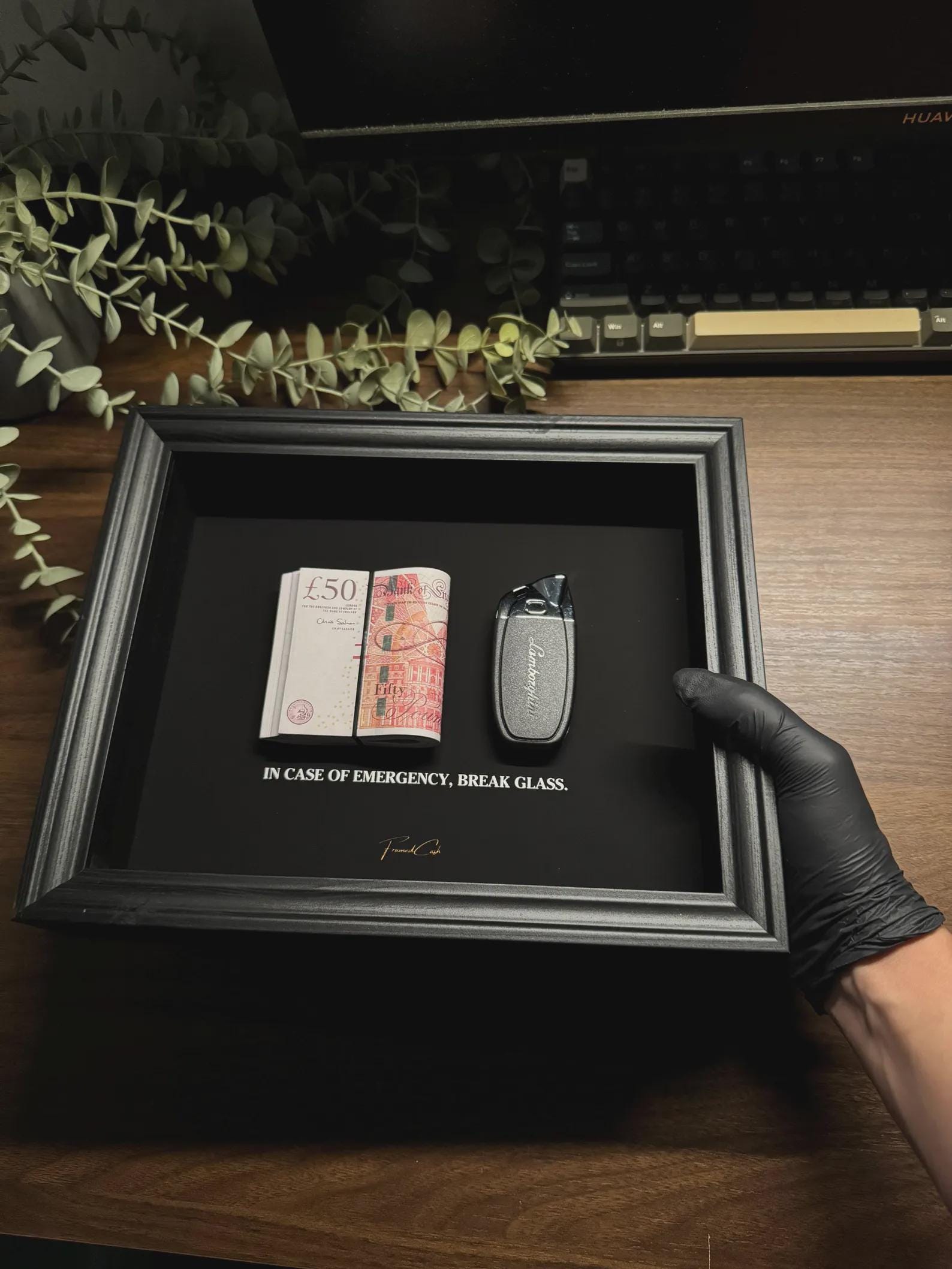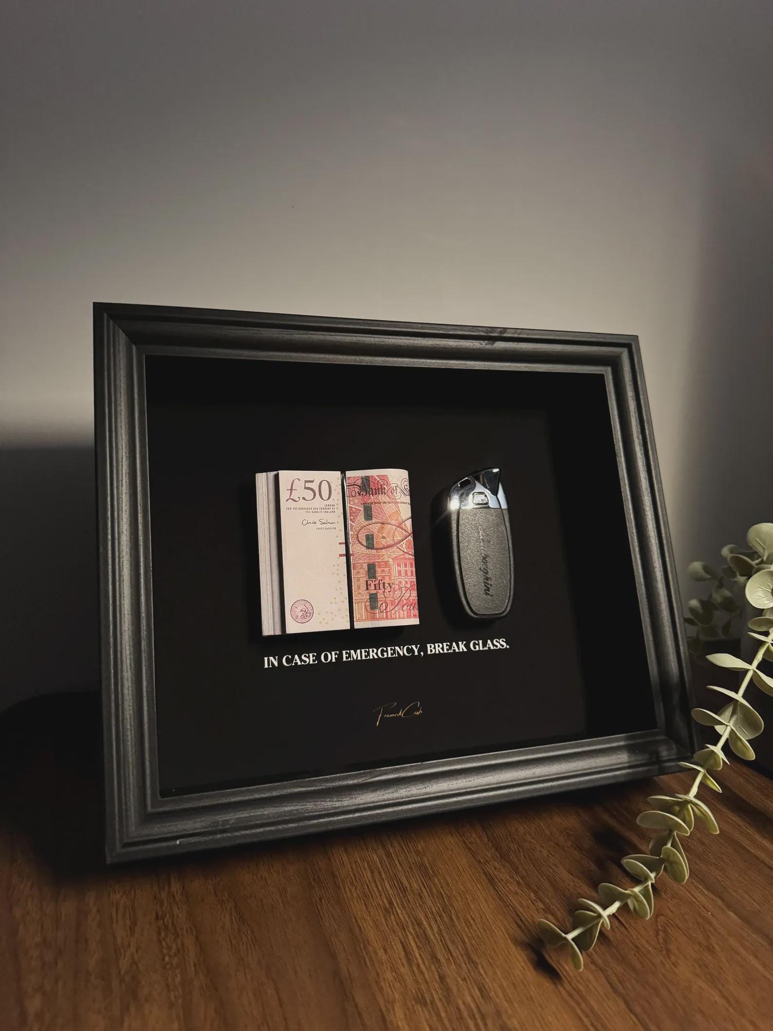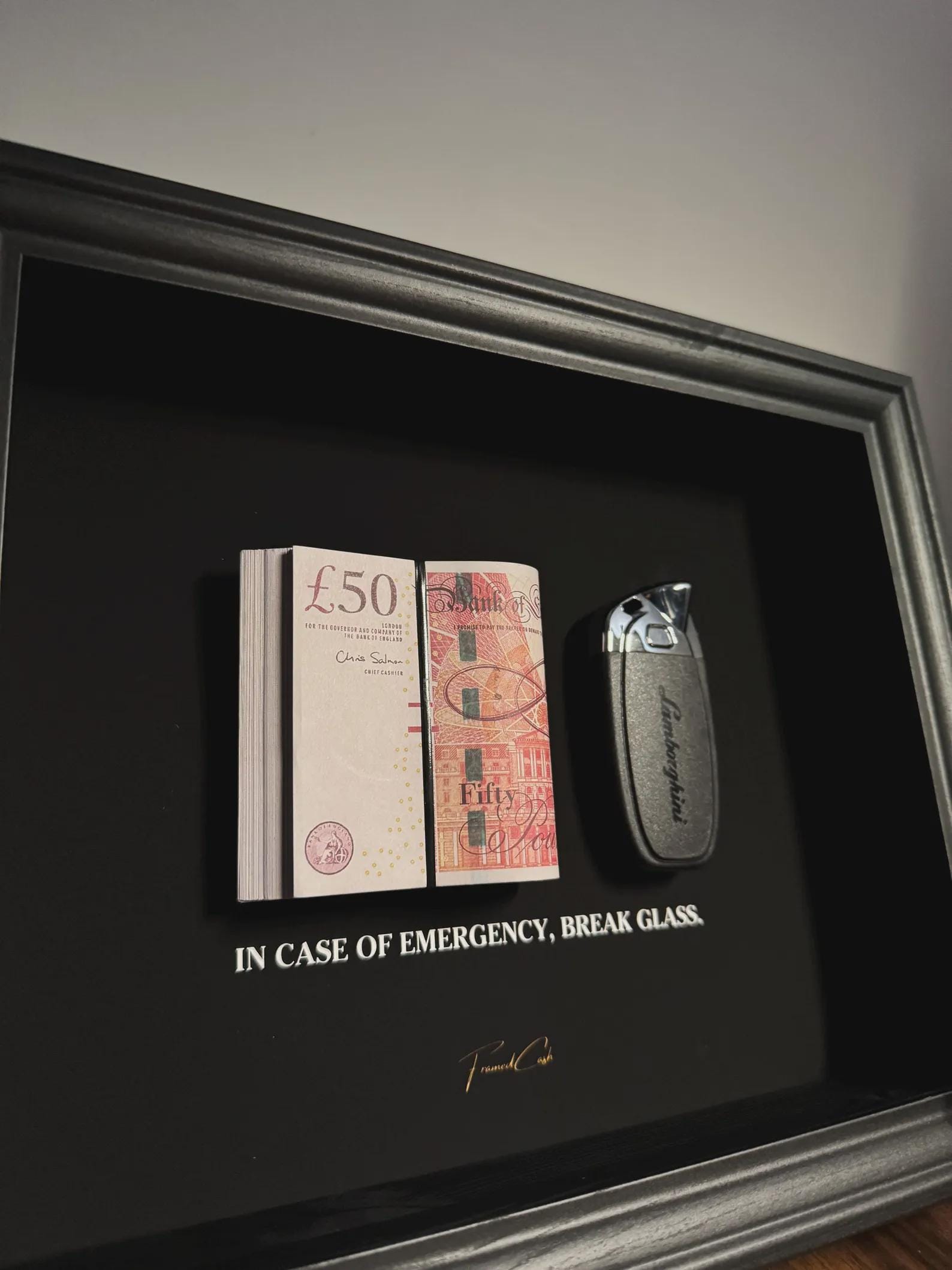 This 25x20 cm handcrafted frame by FramedCash pairs a stack of British £50 notes with a Lamborghini key, set against a jet-black backdrop. A sharp visual reminder that success is built on consistency, vision, and the discipline to keep pushing forward.