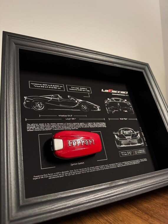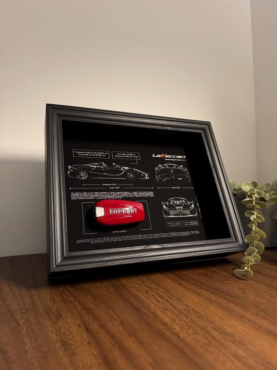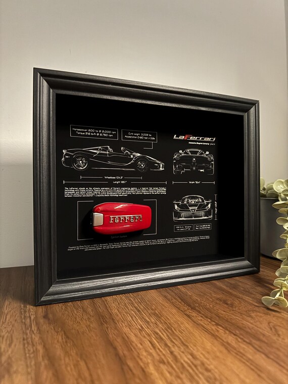 With precision blueprints printed in fine detail and a mounted Ferrari key, this frame embodies innovation, legacy, and the relentless pursuit of excellence.