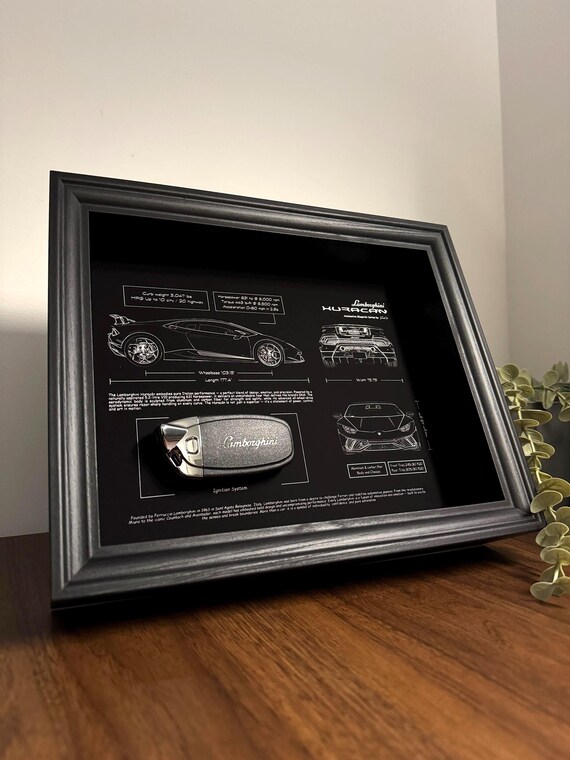 A fusion of design, engineering, and ambition — captured in one display. This frame showcases the detailed blueprint of the legendary Huracán, paired with the Lamborghini key that symbolises performance and perfection.