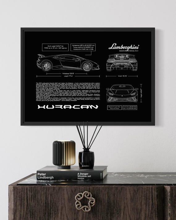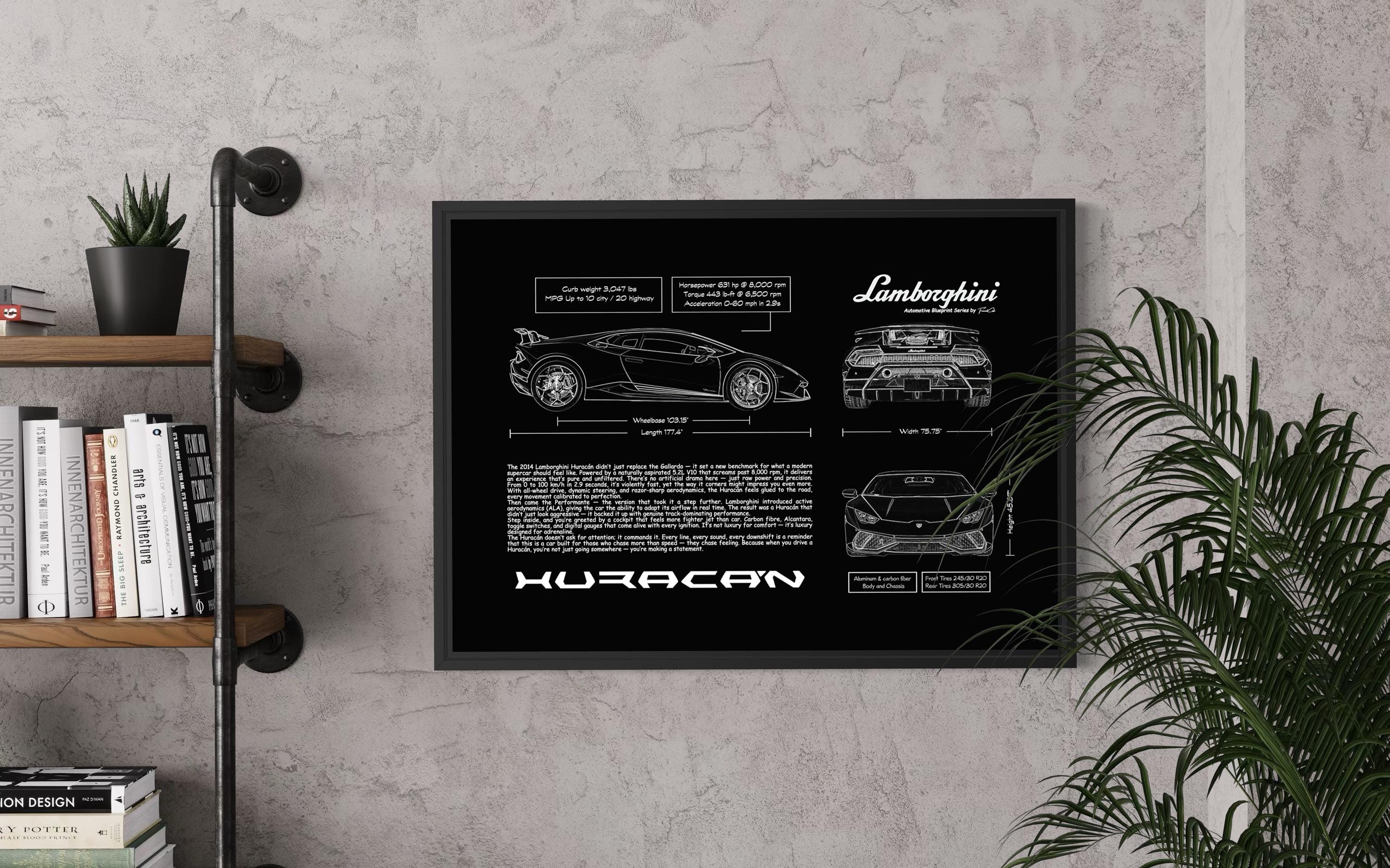 The “Lamborghini Huracán” blueprint frame by FramedCash captures the essence of one of the world’s most celebrated supercars — from its V10 power to its sculpted aerodynamics. Designed for enthusiasts who appreciate automotive artistry and technical perfection, this piece brings the thrill of Lamborghini engineering into your space.