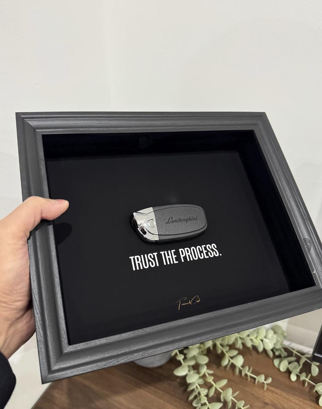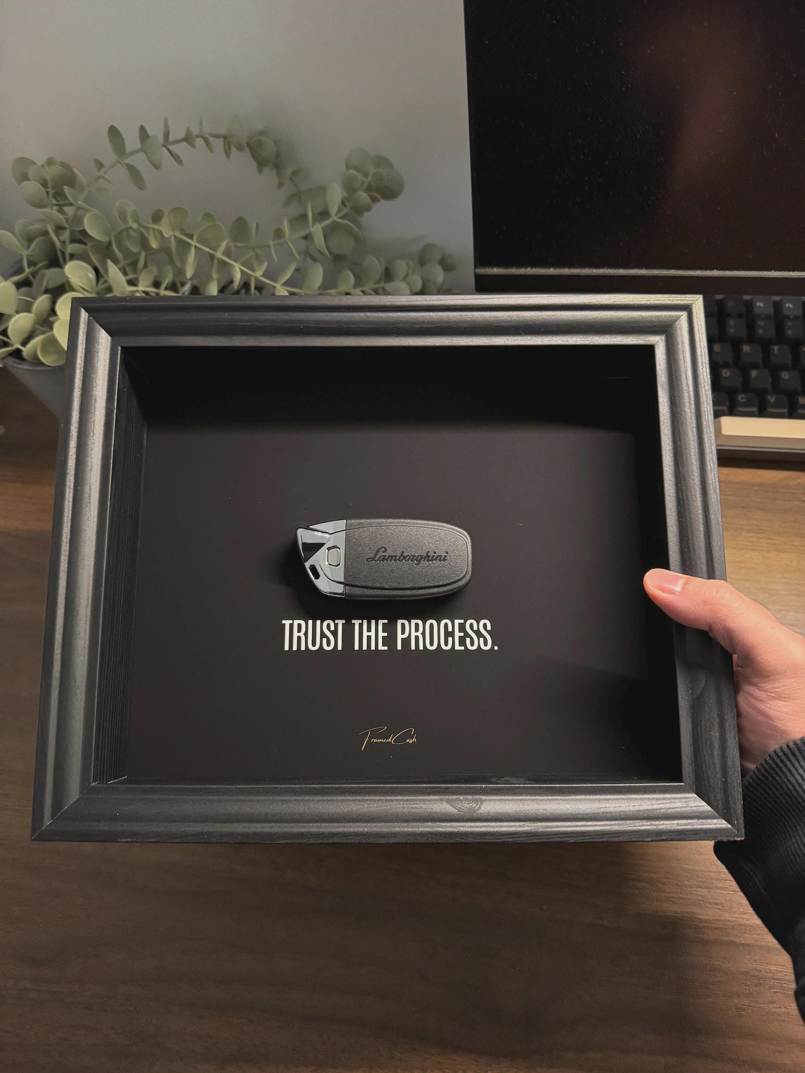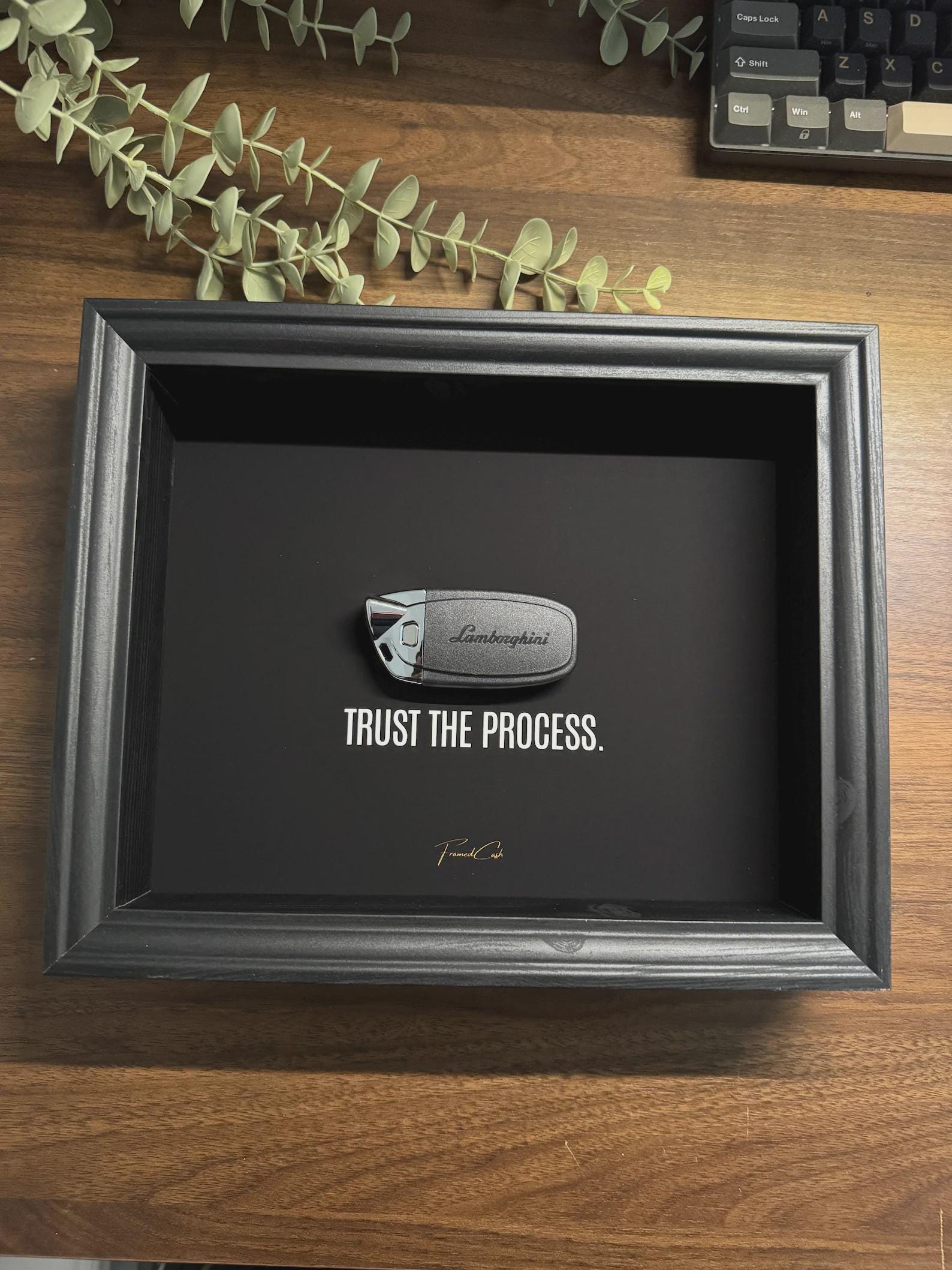 This 25x20 cm handcrafted frame by FramedCash features a sleek Lamborghini key mounted on a minimalist black background, paired with the powerful reminder that patience and discipline always pay off. A bold décor piece that fuels ambition daily.