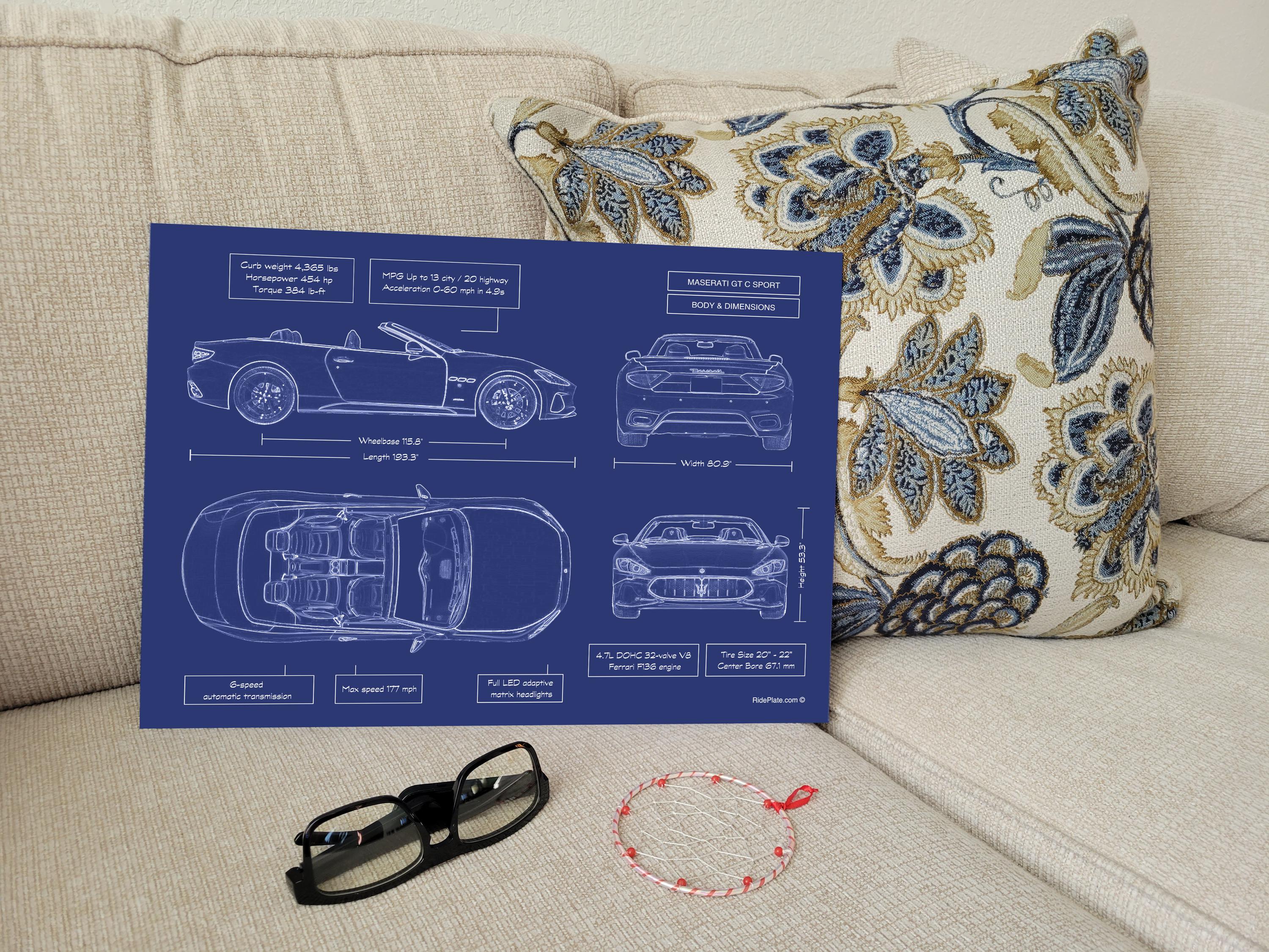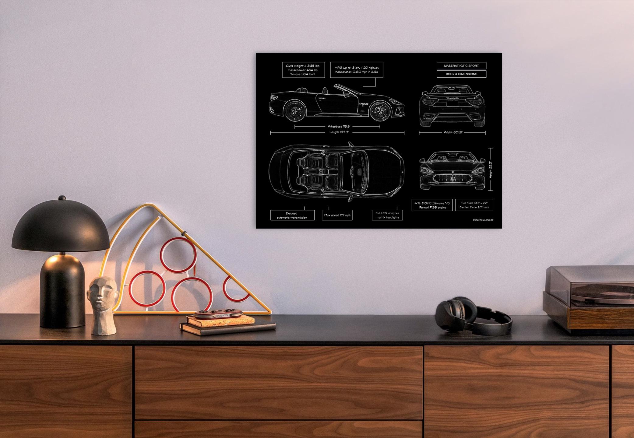 Celebrate the elegant power of the Maserati GT C Sport (2012-2019) with a standout piece of décor. Printed directly on brushed metal, this poster features a refined matte finish that delivers museum-quality depth and sophistication. Whether it’s in the executive office, upscale garage or collector’s study, this artwork makes a bold statement—and it becomes unforgettable when you add the recipient’s name or their car’s VIN at no extra charge. With the included magnetic mounting system, you can have it displayed in under a minute—no tools, no drilling, just instant elegance.