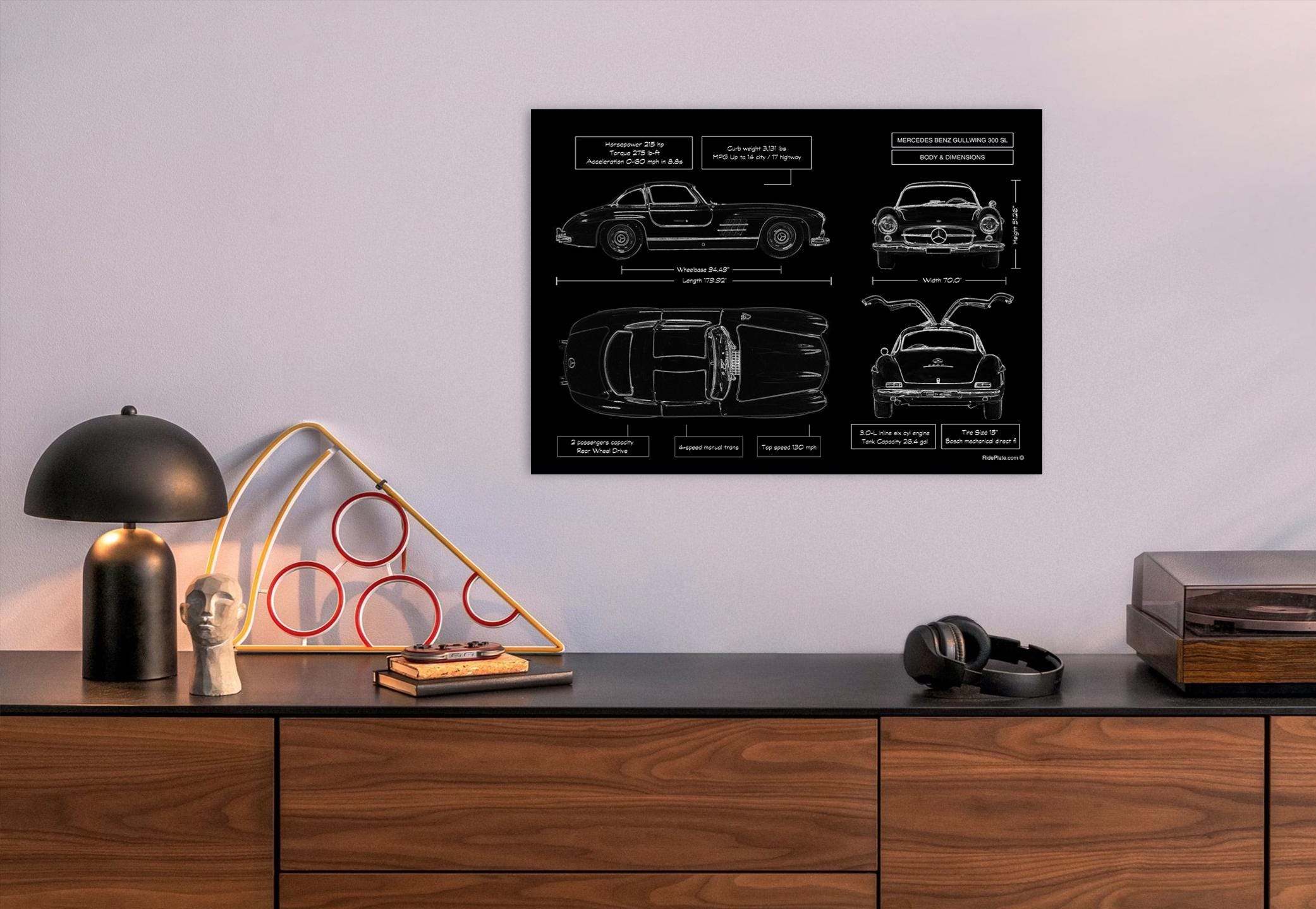 Celebrate the iconic Mercedes‑Benz 300 SL Gullwing Blueprint Metal Poster—a classic born from racing pedigree and one of the most admired sports cars in history. Printed directly onto premium brushed metal, it delivers a museum-quality matte finish, elevating heritage engineering into sophisticated wall art. This piece makes a lasting impression whether in a collector’s garage, an executive office, or a stylish home. And because the hardest-to-buy gift is one that feels personal, you can add the recipient’s name or their car’s VIN at no extra charge. With the included magnetic mounting system, display is effortless—stick it up and it’s done in under a minute.
