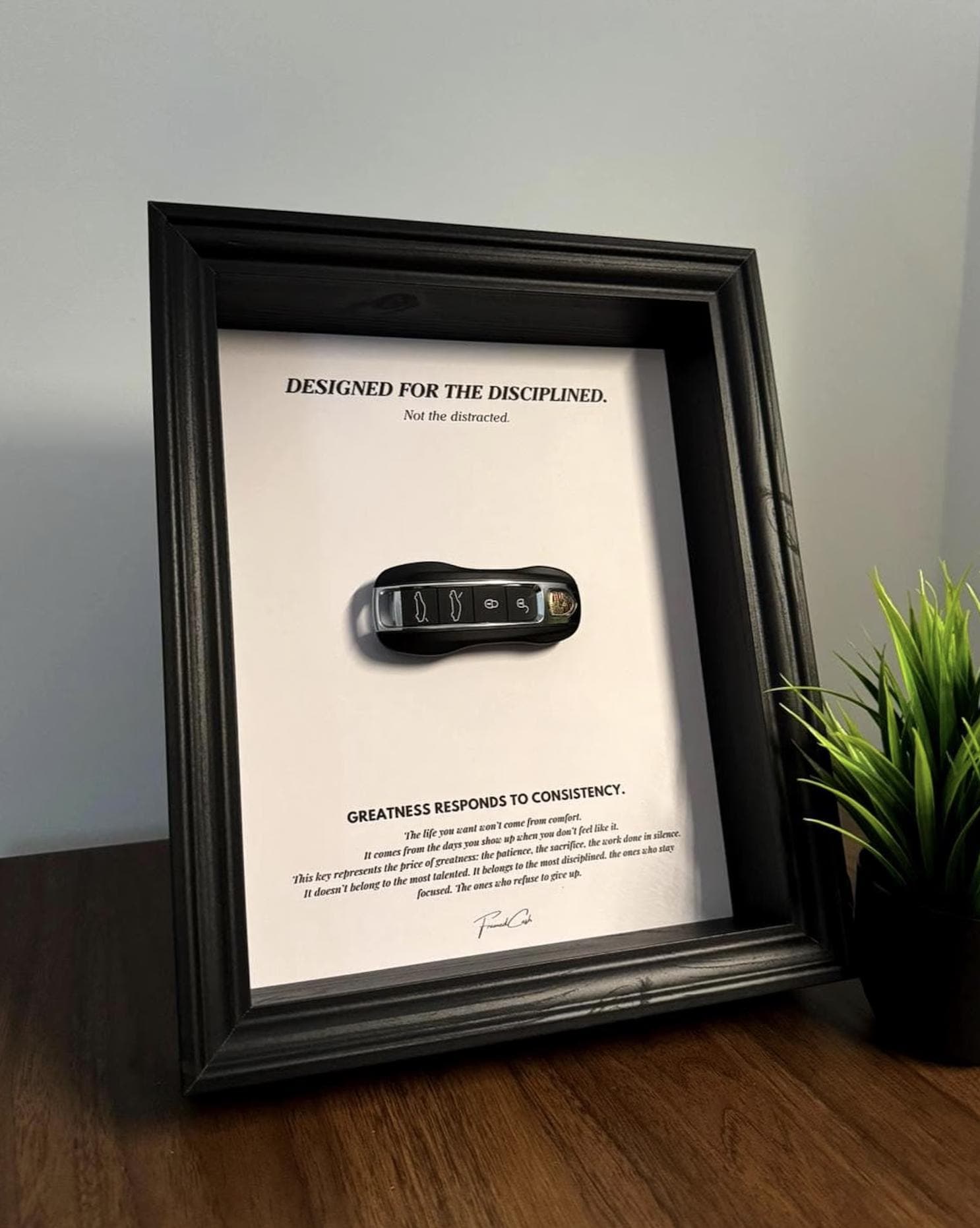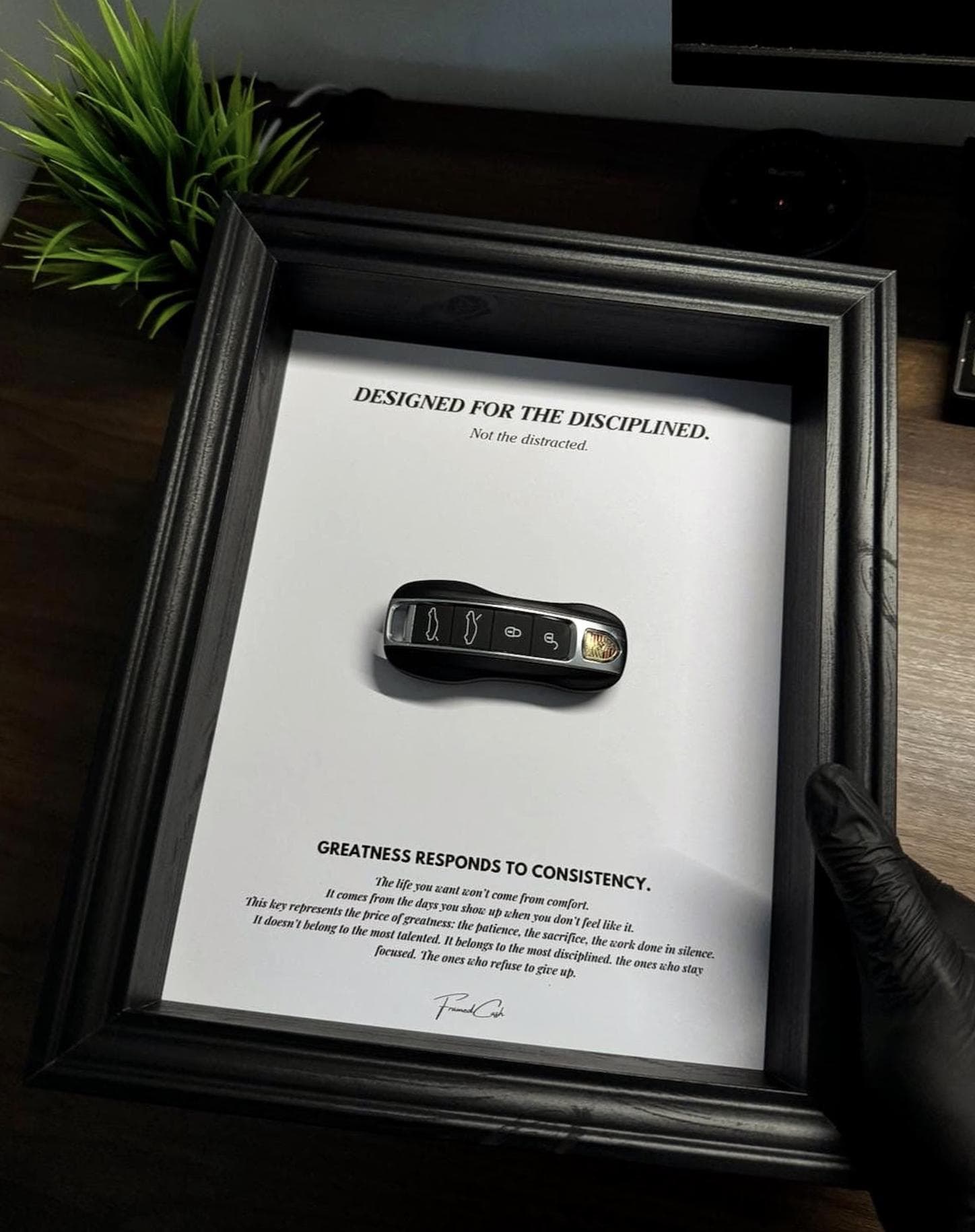Featuring a clean white backdrop and a sleek Porsche-style key, this piece isn’t flex.