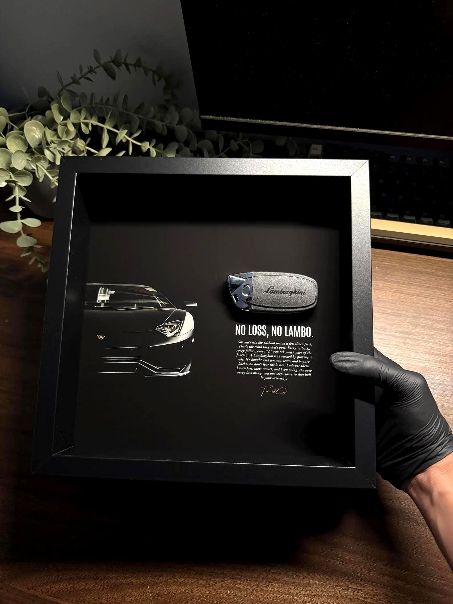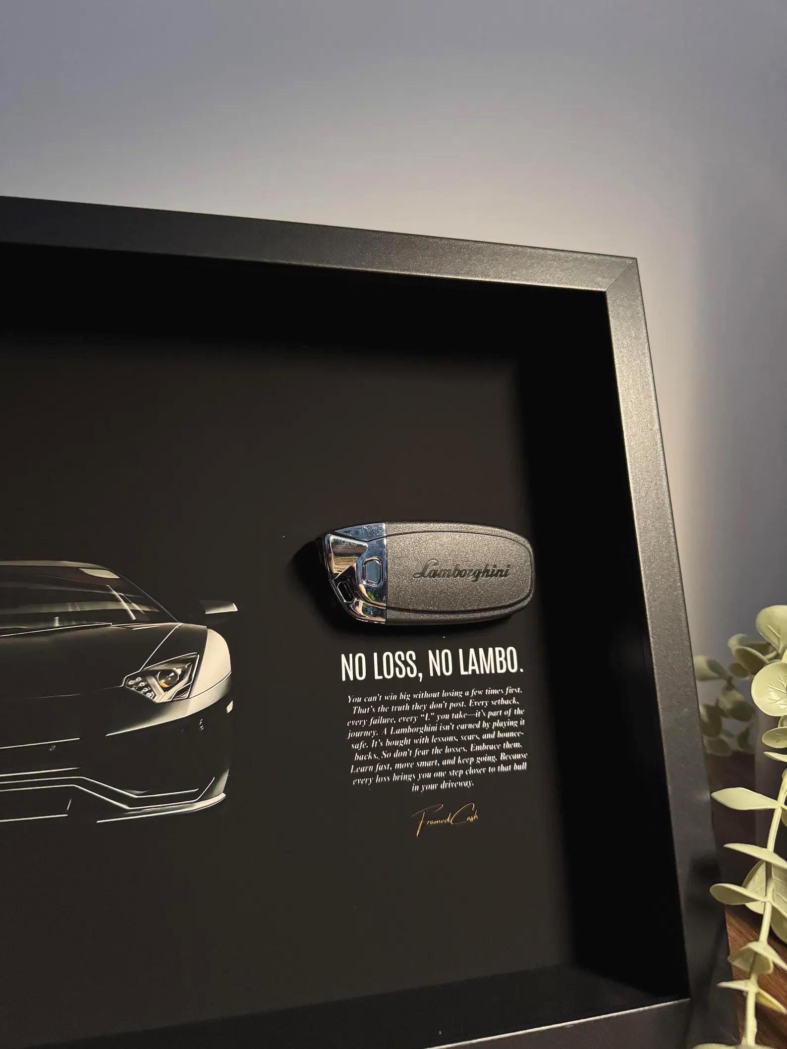 This 25x25 cm luxury frame by FramedCash features a Lamborghini key mounted on a deep matte-black backdrop with an image of the iconic Lamborghini front profile. Below it, the quote “No Loss, No Lambo” reminds you that ambition comes with risks — and only those who endure the losses get to live the dream.
