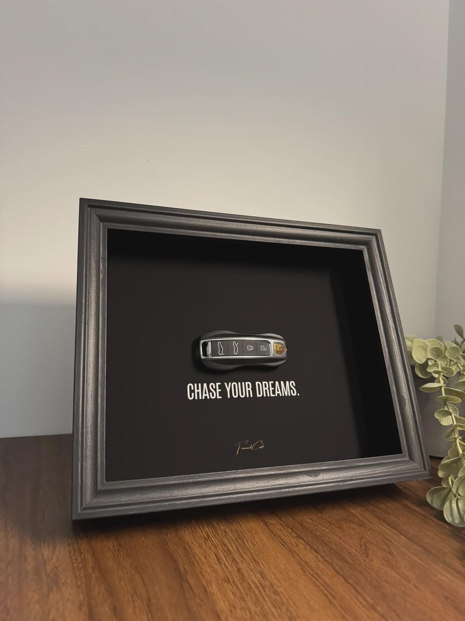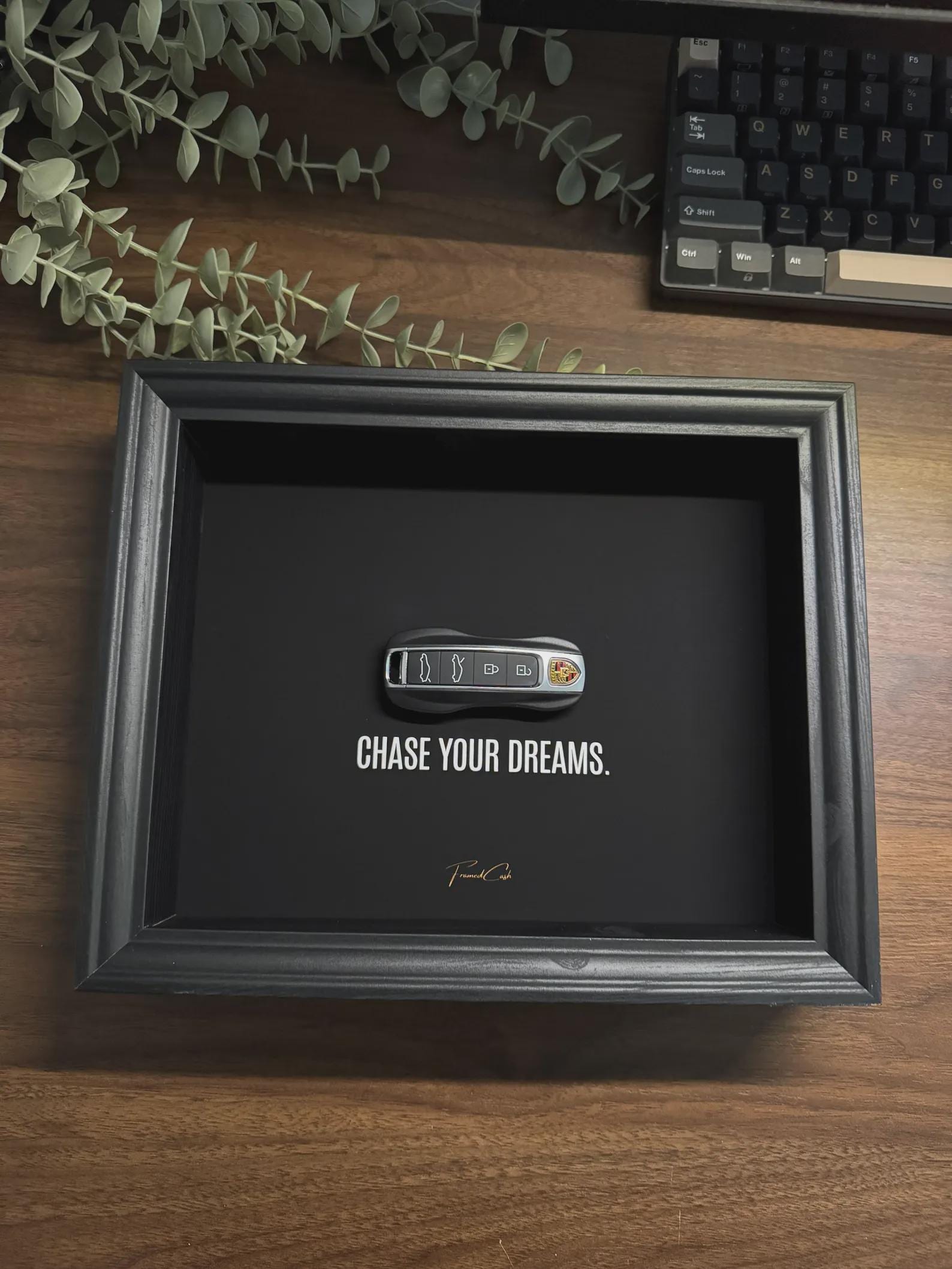 This 25x20 cm handmade shadow box by FramedCash features a Porsche key on a matte black backdrop, paired with the bold reminder to Chase Your Dreams. It’s more than art — it’s a motivator, a statement piece, and a daily push toward your goals.