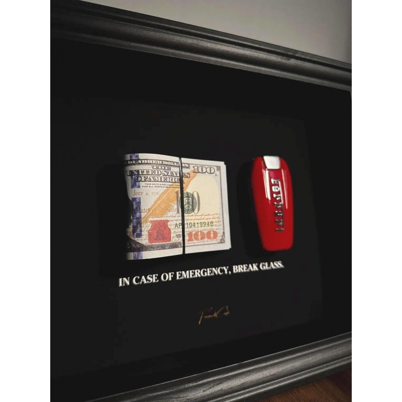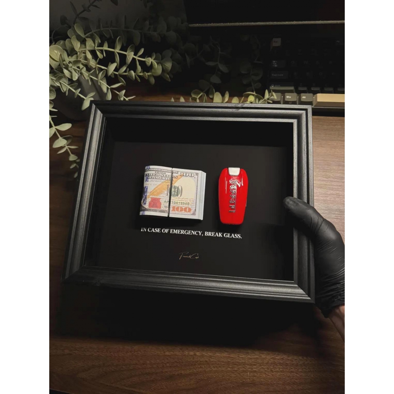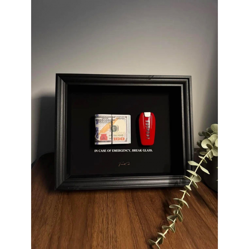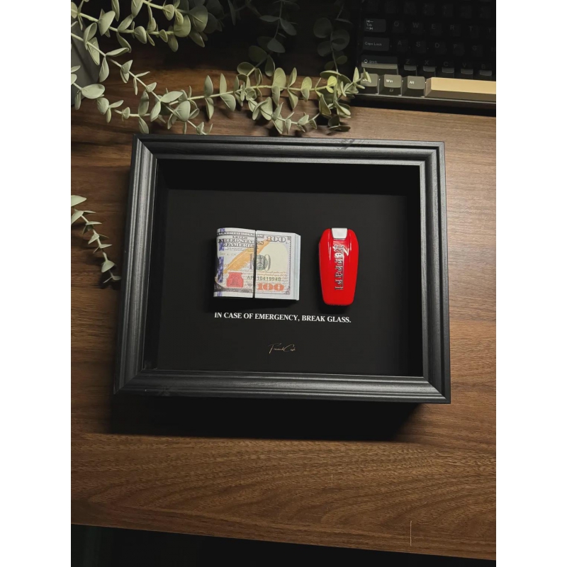 This 25x20 cm handmade shadow box by FramedCash combines two timeless motivators: a stack of US dollars and a Ferrari key. Side by side, they create the ultimate reminder that wealth and reward go hand-in-hand with bold decisions and relentless drive.