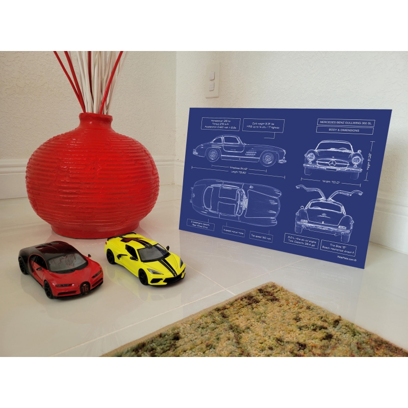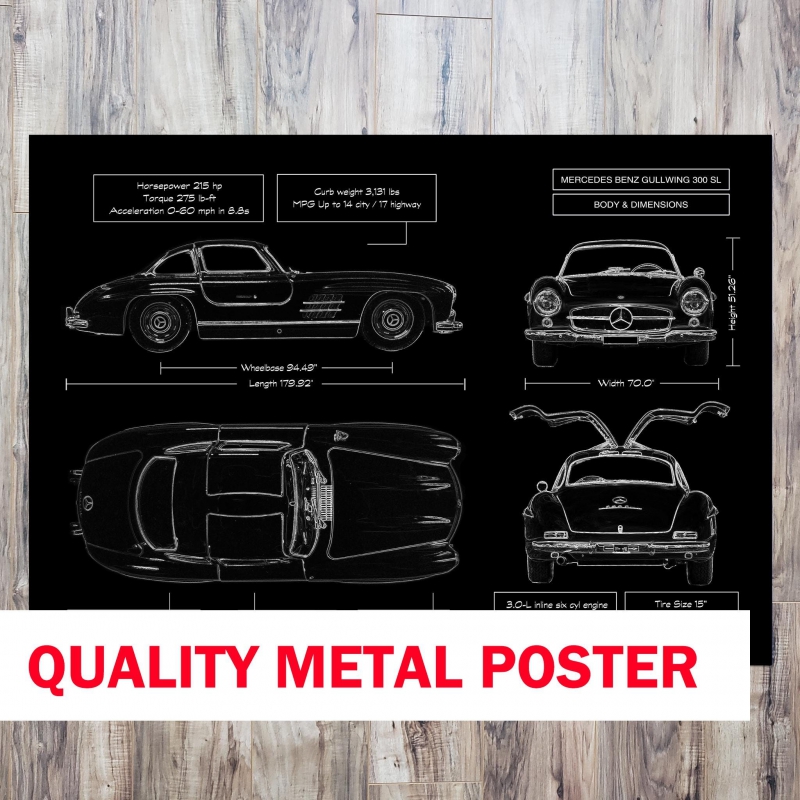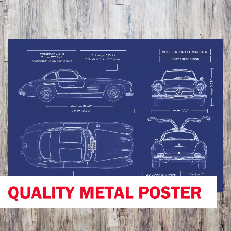 Celebrate the iconic Mercedes‑Benz 300 SL Gullwing Blueprint Metal Poster—a classic born from racing pedigree and one of the most admired sports cars in history. Printed directly onto premium brushed metal, it delivers a museum-quality matte finish, elevating heritage engineering into sophisticated wall art. This piece makes a lasting impression whether in a collector’s garage, an executive office, or a stylish home. And because the hardest-to-buy gift is one that feels personal, you can add the recipient’s name or their car’s VIN at no extra charge. With the included magnetic mounting system, display is effortless—stick it up and it’s done in under a minute.