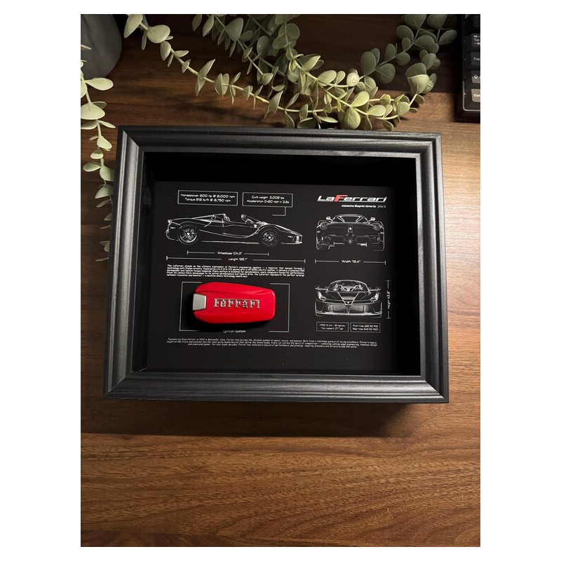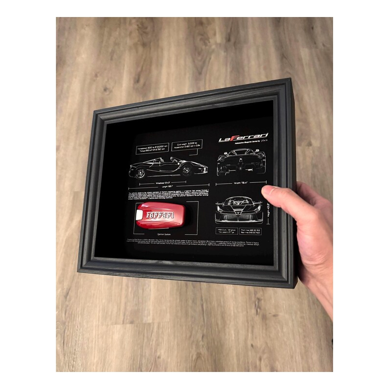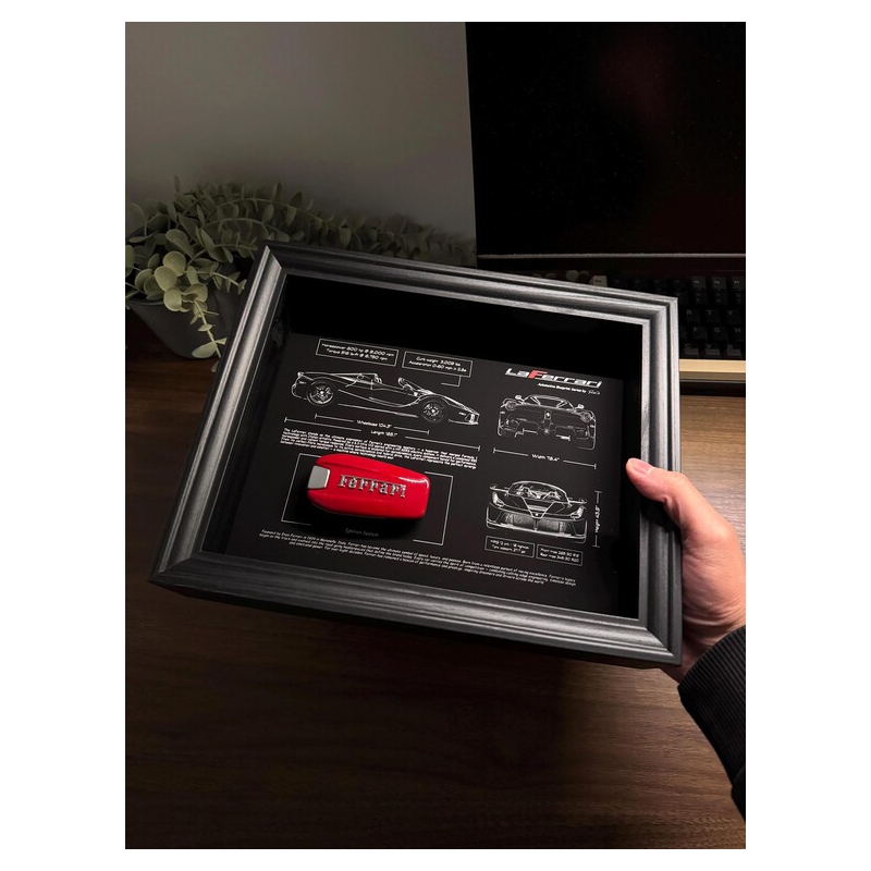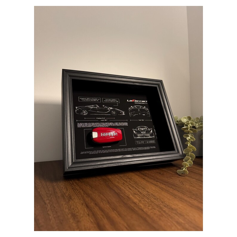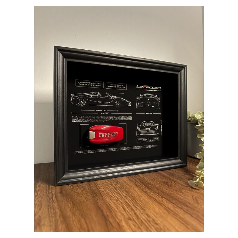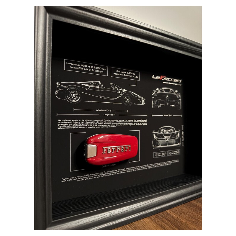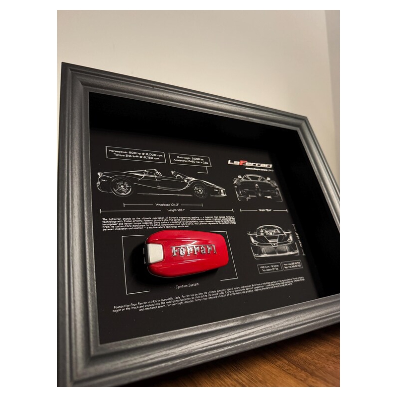 With precision blueprints printed in fine detail and a mounted Ferrari key, this frame embodies innovation, legacy, and the relentless pursuit of excellence.