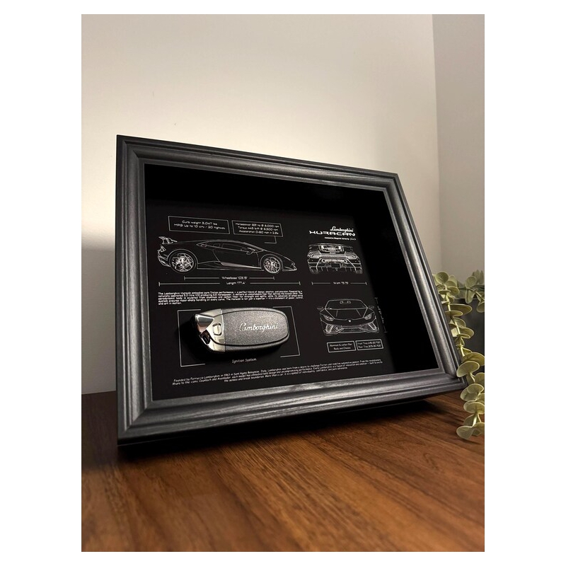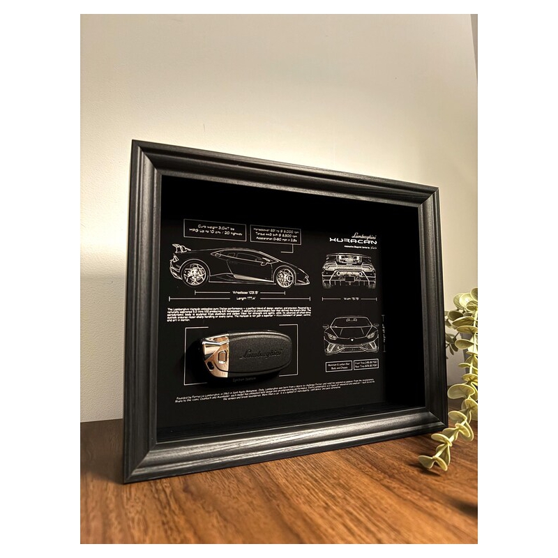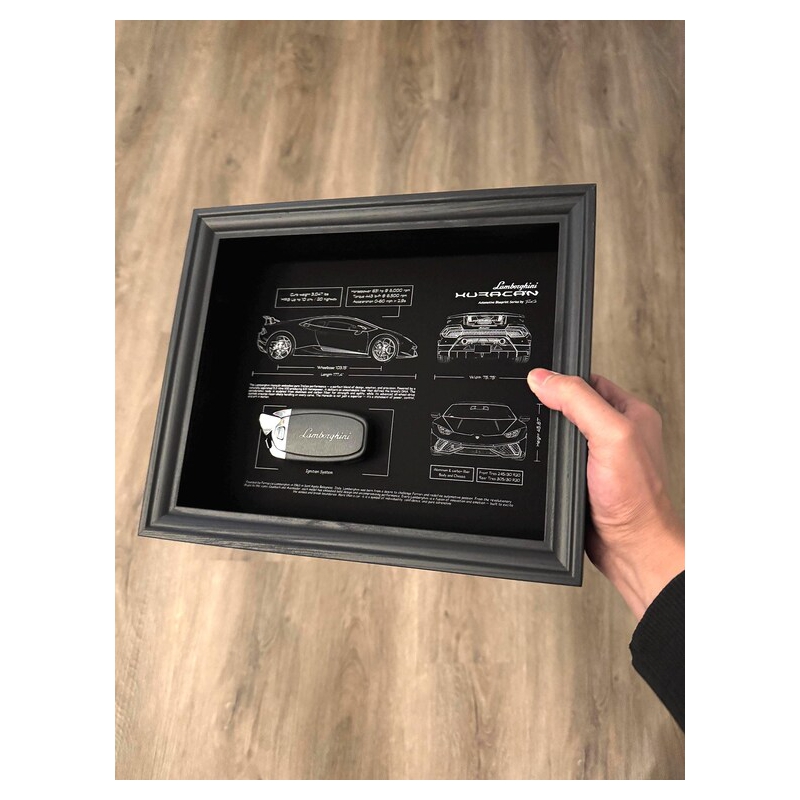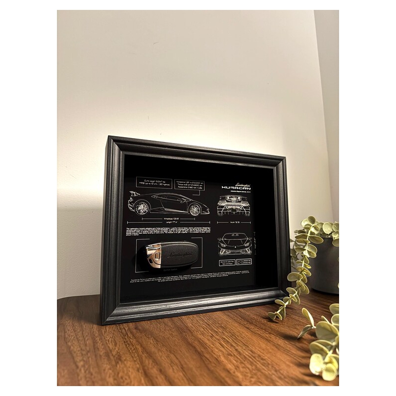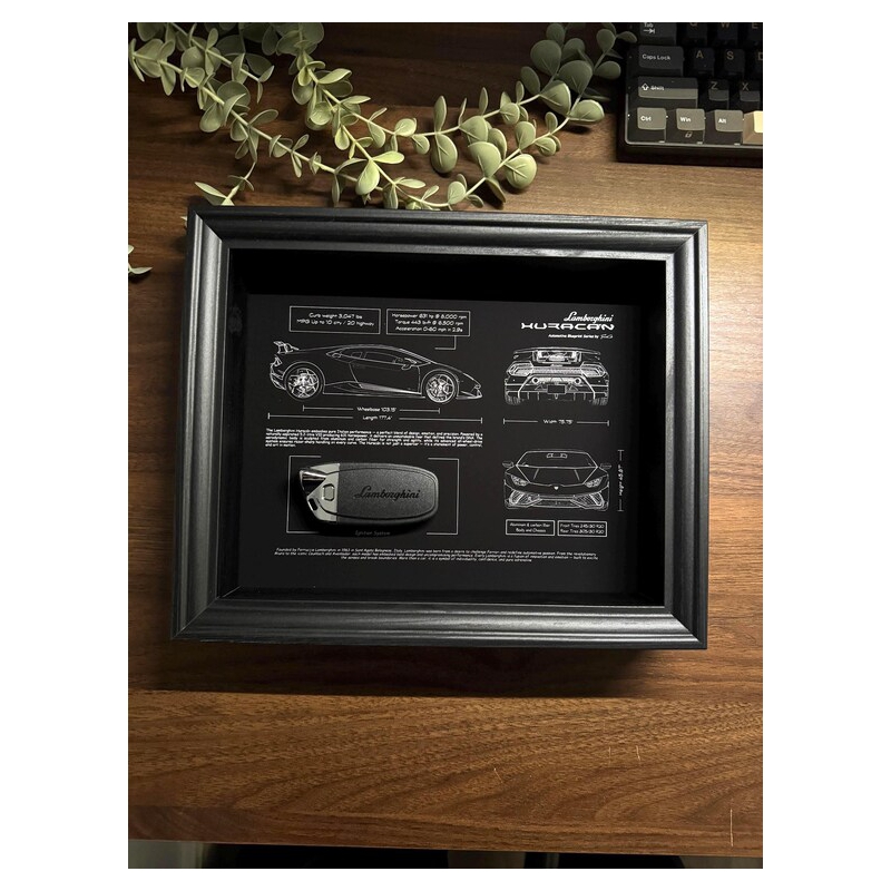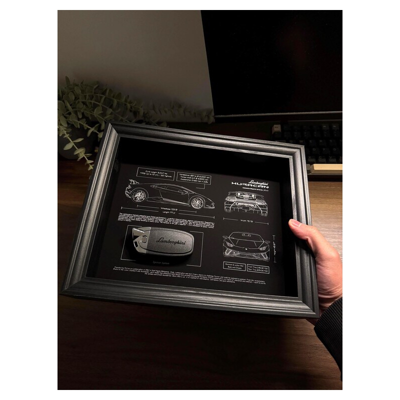 A fusion of design, engineering, and ambition — captured in one display. This frame showcases the detailed blueprint of the legendary Huracán, paired with the Lamborghini key that symbolises performance and perfection.