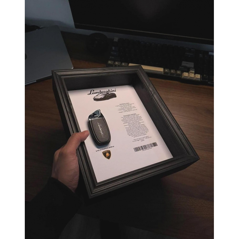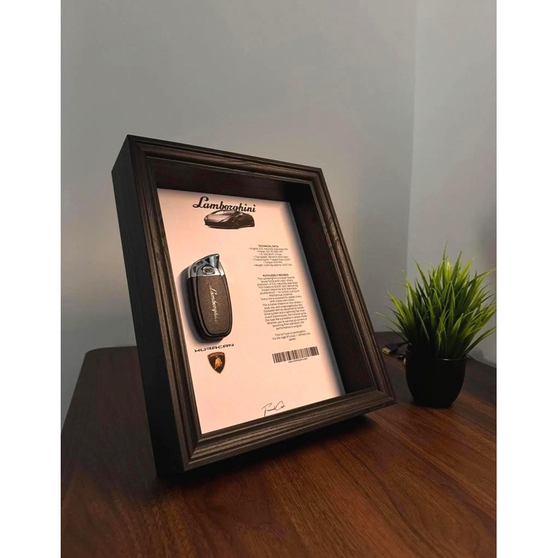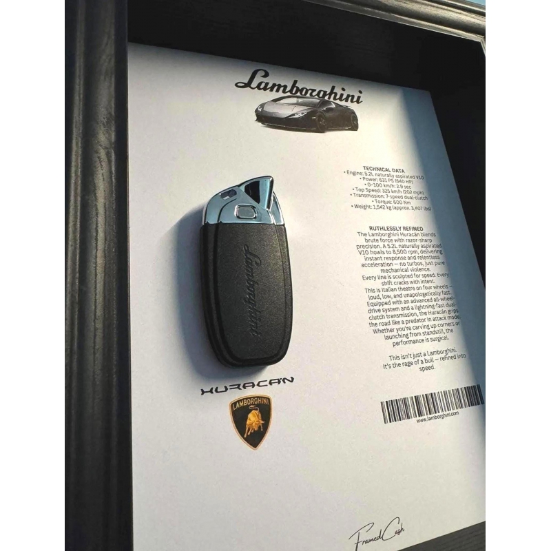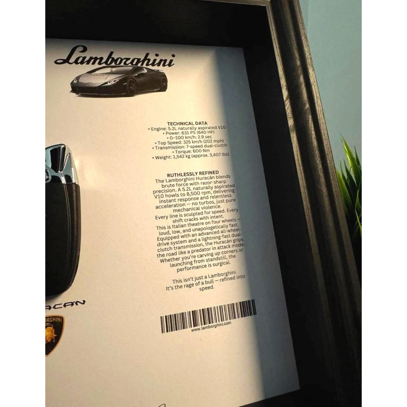 This handcrafted display features the signature Huracán key, captured in a minimal layout with crisp specs and an official silhouette sketch. A tribute to a modern supercar icon that redefined everyday performance with brutal power and unmistakable drama.