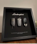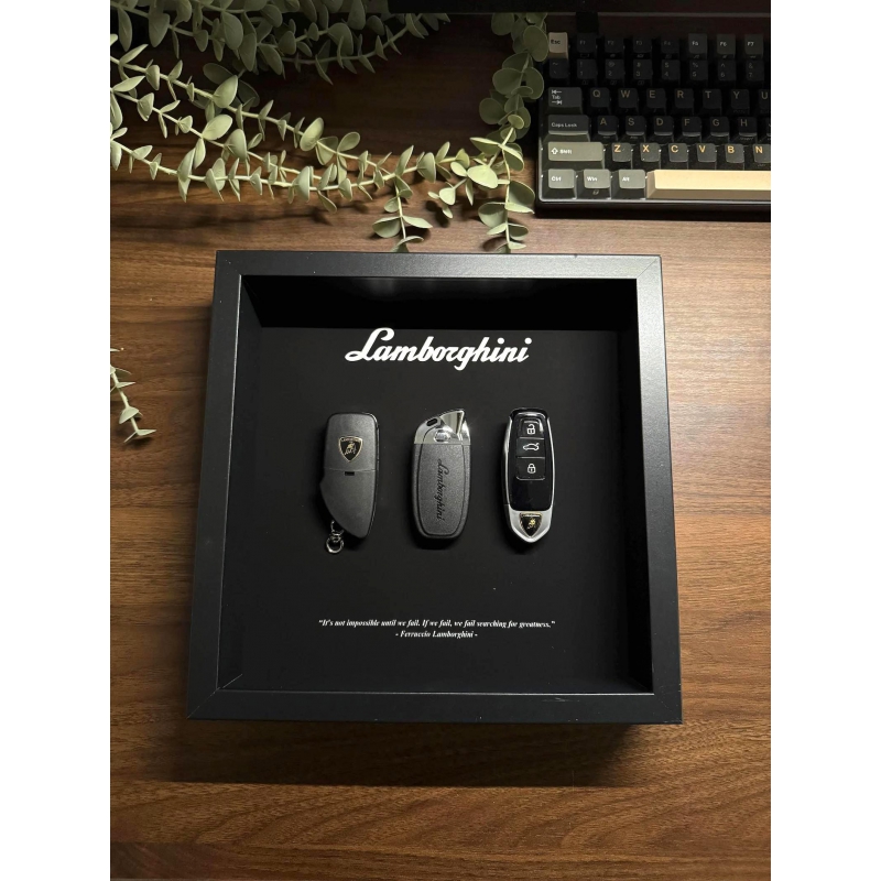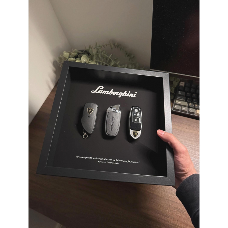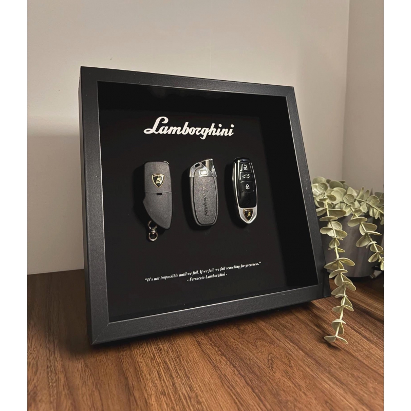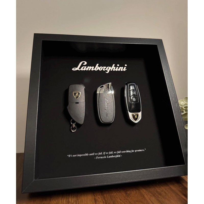 This 25x25 cm limited edition frame by FramedCash showcases a trio of authentic Lamborghini keys, each representing an era of uncompromising ambition. Centered beneath the iconic Lamborghini script and Ferruccio’s own words, it is more than art — it’s a statement.