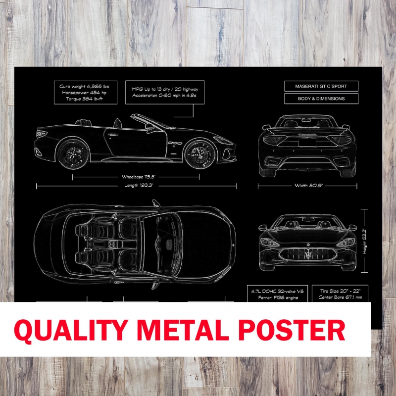 Celebrate the elegant power of the Maserati GT C Sport (2012-2019) with a standout piece of décor. Printed directly on brushed metal, this poster features a refined matte finish that delivers museum-quality depth and sophistication. Whether it’s in the executive office, upscale garage or collector’s study, this artwork makes a bold statement—and it becomes unforgettable when you add the recipient’s name or their car’s VIN at no extra charge. With the included magnetic mounting system, you can have it displayed in under a minute—no tools, no drilling, just instant elegance.