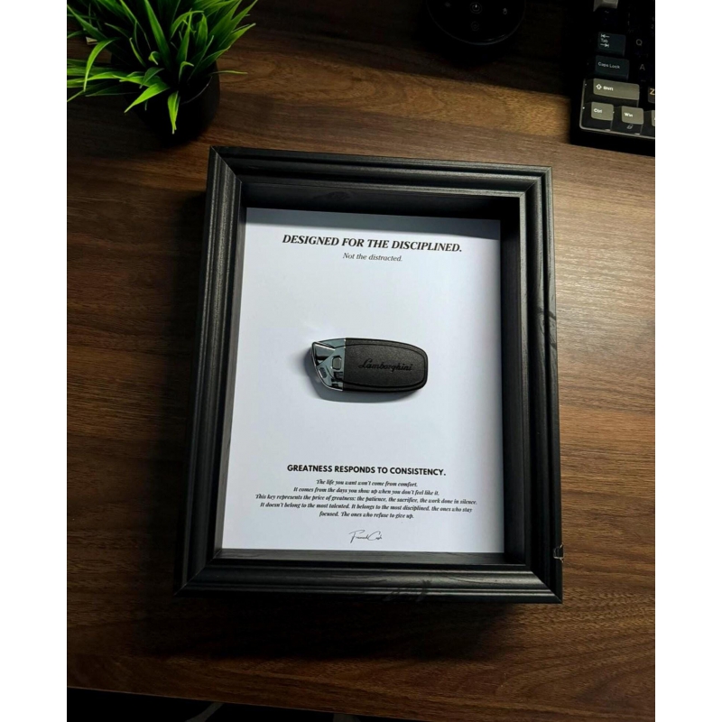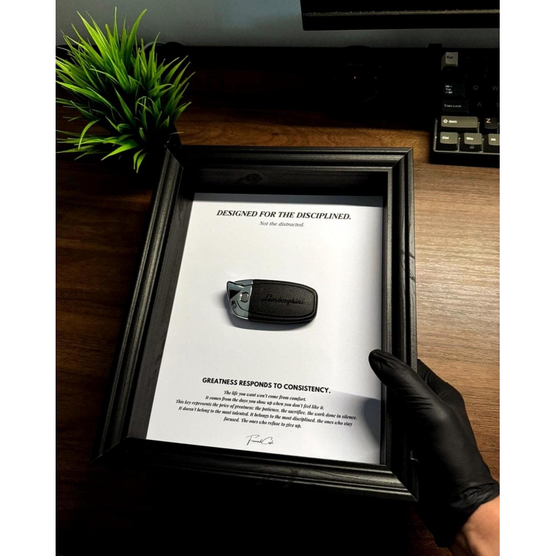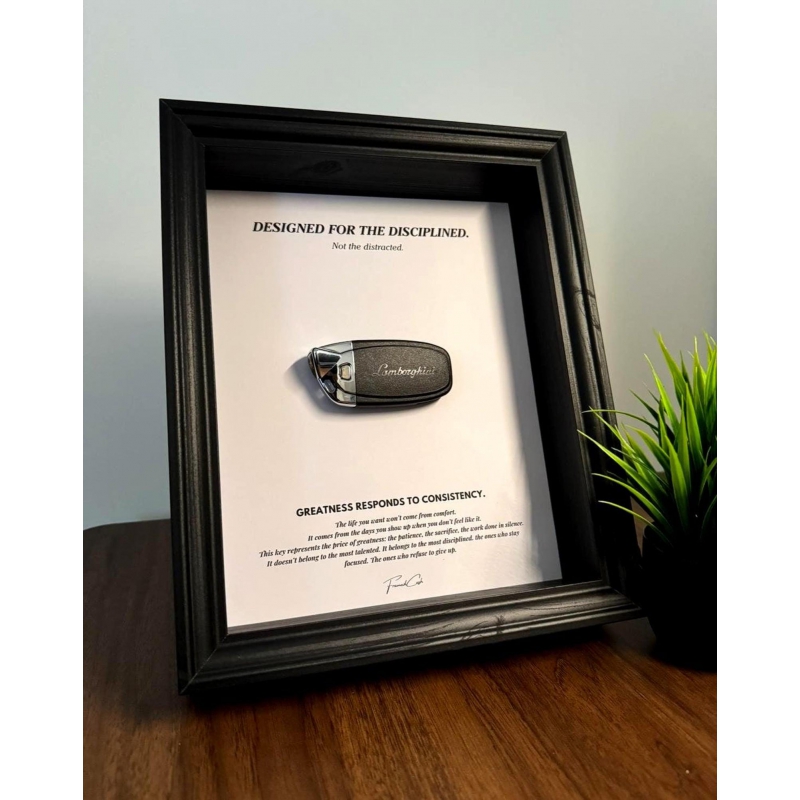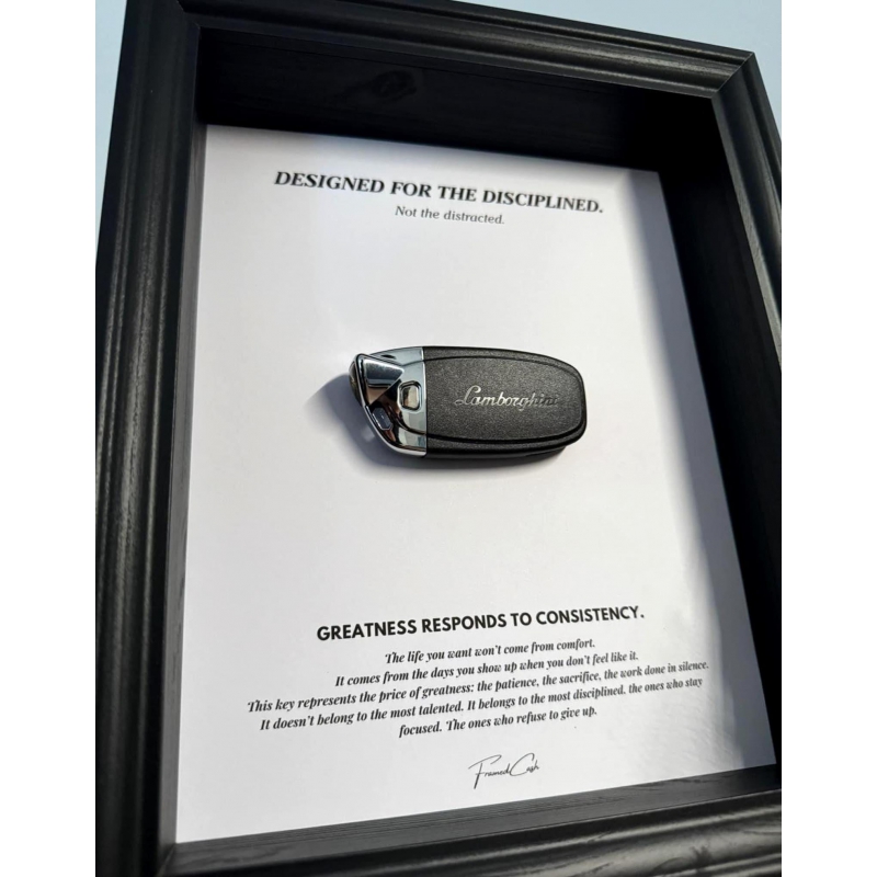 Featuring a sleek Lamborghini-style key mounted on a clean white background, this piece speaks to the mindset of those who refuse to quit.