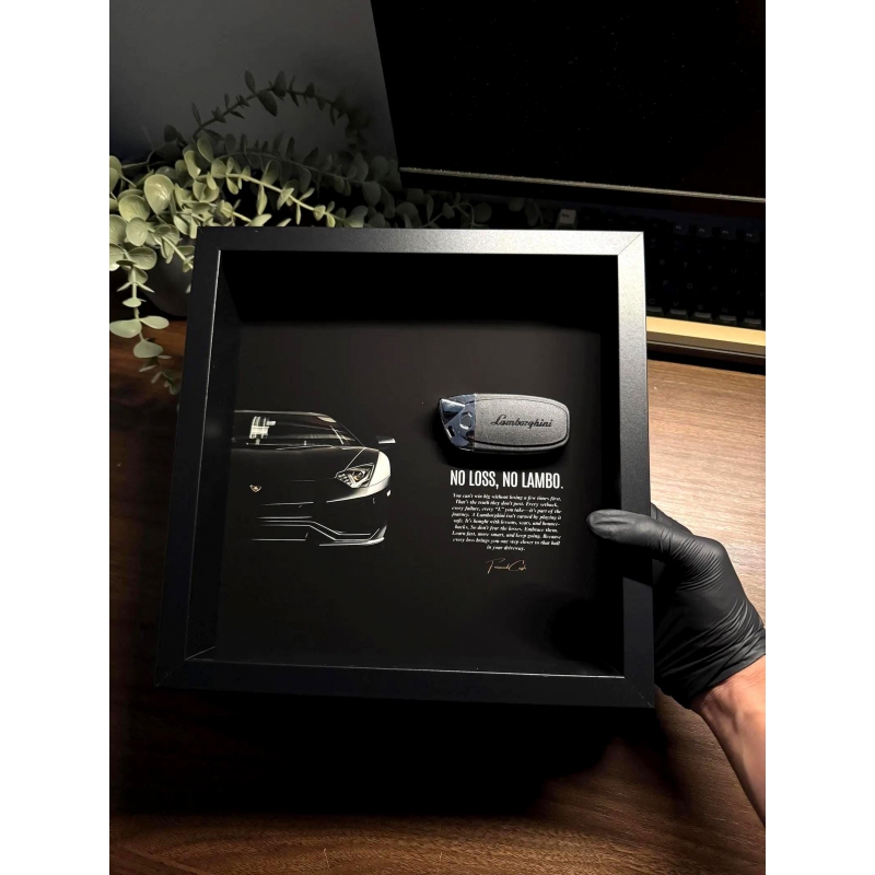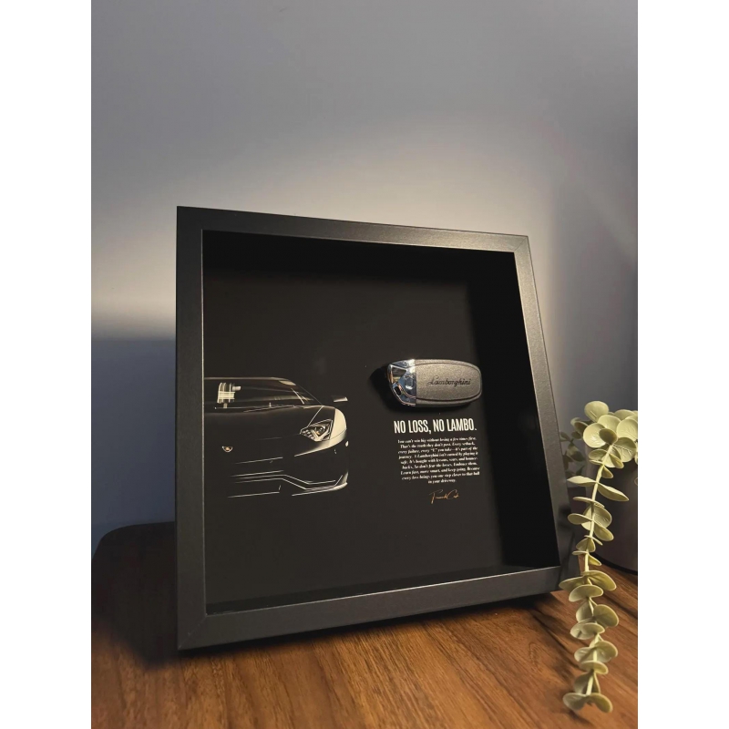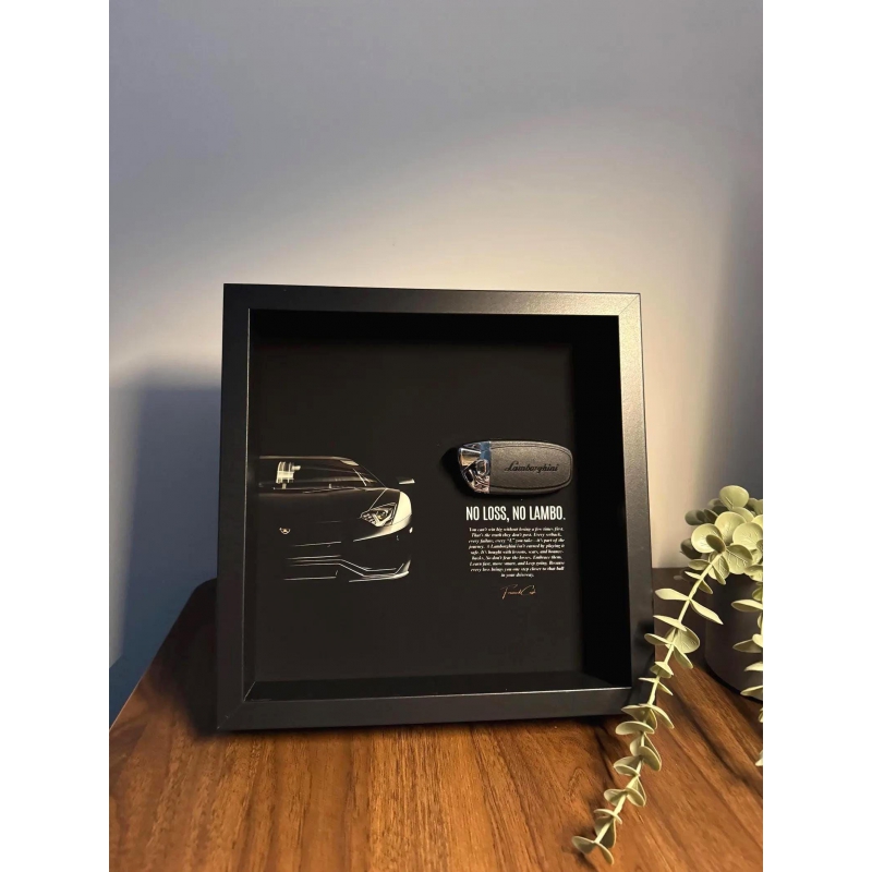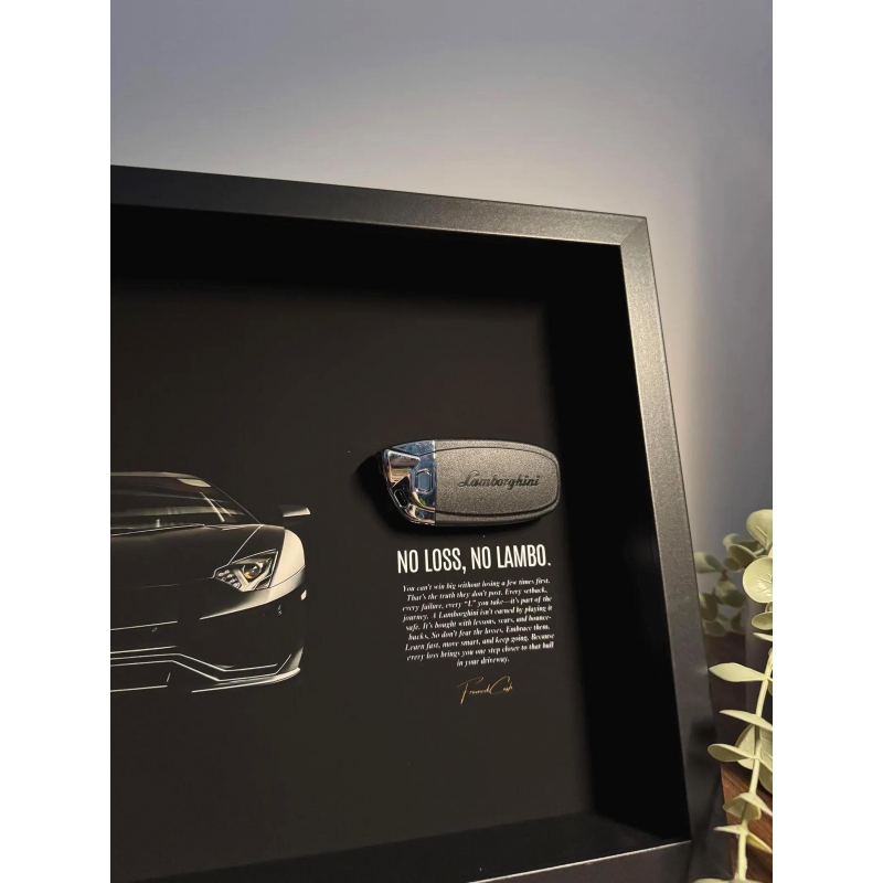 This 25x25 cm luxury frame by FramedCash features a Lamborghini key mounted on a deep matte-black backdrop with an image of the iconic Lamborghini front profile. Below it, the quote “No Loss, No Lambo” reminds you that ambition comes with risks — and only those who endure the losses get to live the dream.
