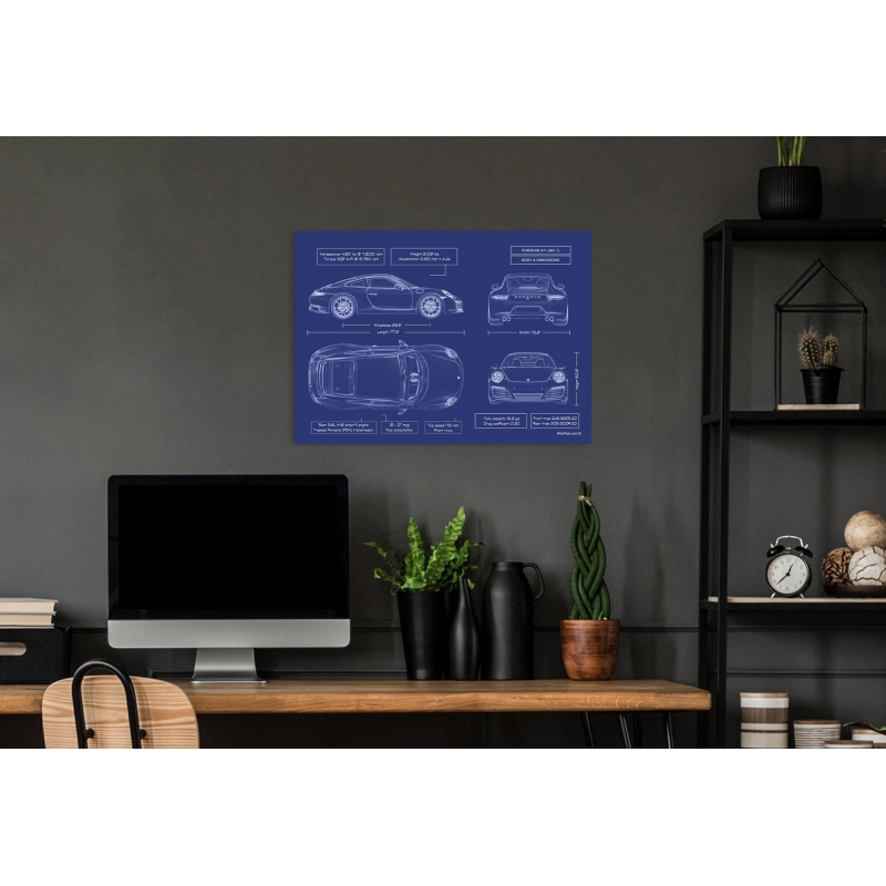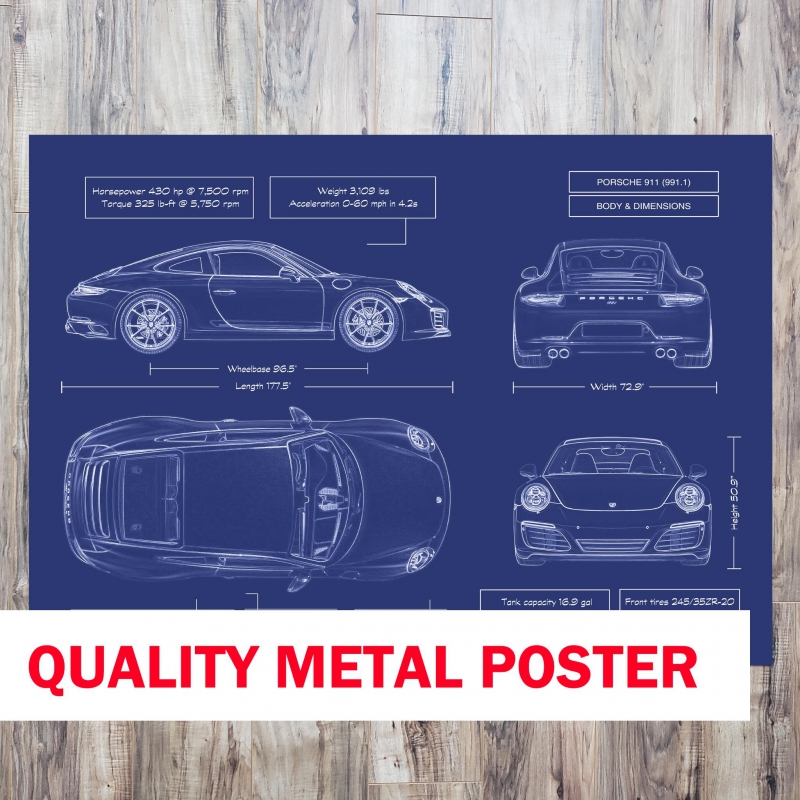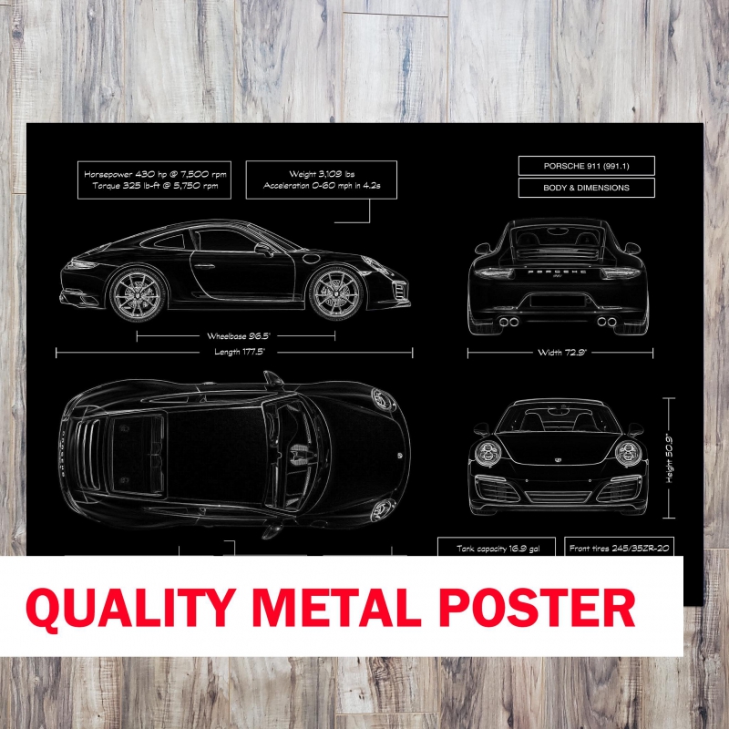 This premium metal-printed piece celebrates the seventh-generation Porsche 911 (991) Coupe (991.1 series, 2012-2016) — the last naturally aspirated base 911 before the turbo era.