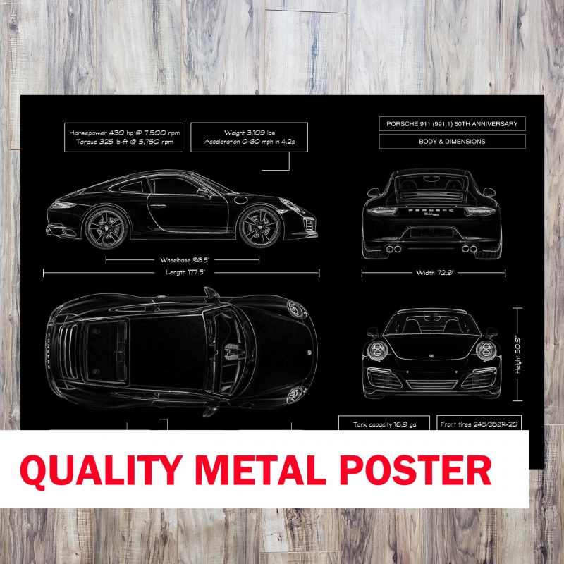 This premium metal-printed masterpiece honours the 50th Anniversary edition of the Porsche 911 (991.1 generation). Printed directly on brushed metal, it features a museum-quality matte finish that captures every iconic line, wide-body stance and road-ready detail with stunning clarity. Whether it’s mounted in your garage, executive office, man cave or collector showroom, this piece demands attention and respect.