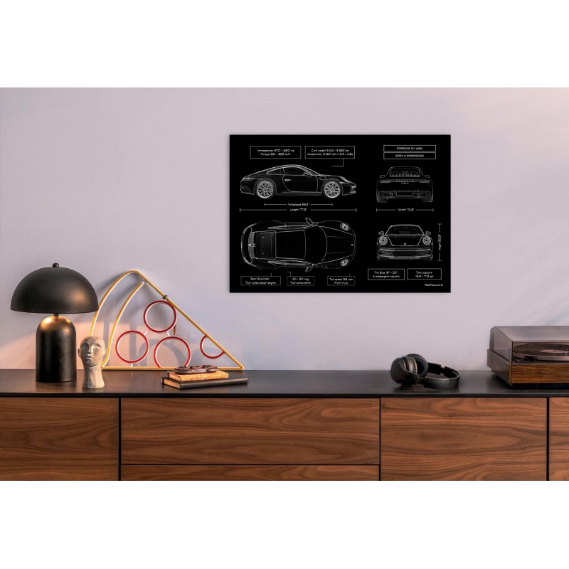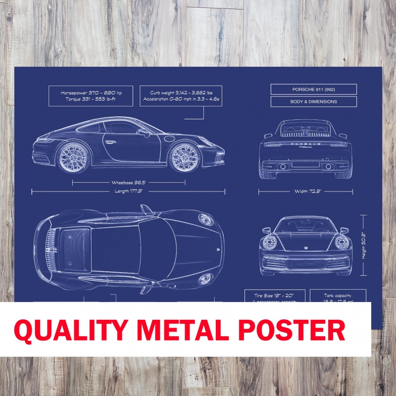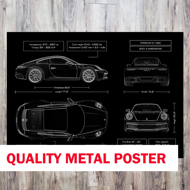Celebrate the eighth-generation Porsche 911 (992) Coupe (2018-present) — a benchmark of automotive engineering and style. Printed directly on premium brushed metal, with a sleek matte finish, this poster transforms horsepower into high-end décor. Whether it graces the wall of your garage, executive office, man cave or showroom, it makes a bold statement. For the gearhead, the lawyer with speed in their blood, or the entrepreneur who surrounds themselves with excellence — personalize it with their name or car’s VIN at no extra cost. With the included magnetic mounting system, you’ll have it displayed in under a minute — no tools, no drilling, just instant prestige.