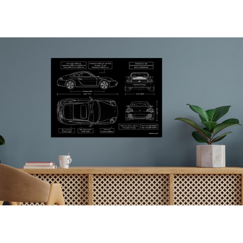 This standout metal-printed piece honors the Porsche 911 996 Blueprint Metal Poster—the fifth-generation Porsche 911 built from 1997-2005. This generation broke new ground with modern engineering and advanced styling, and now it’s transformed into refined interior décor. Printed directly onto brushed metal and finished with a sleek matte texture, it converts raw performance into refined wall art. Whether displayed in your garage, executive office, man-cave or showroom, this piece is built to impress.