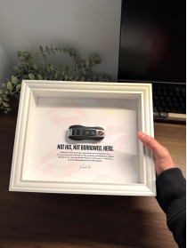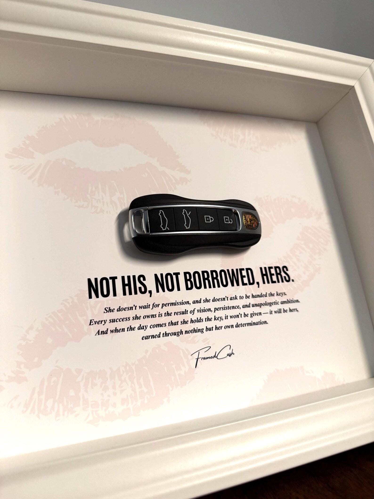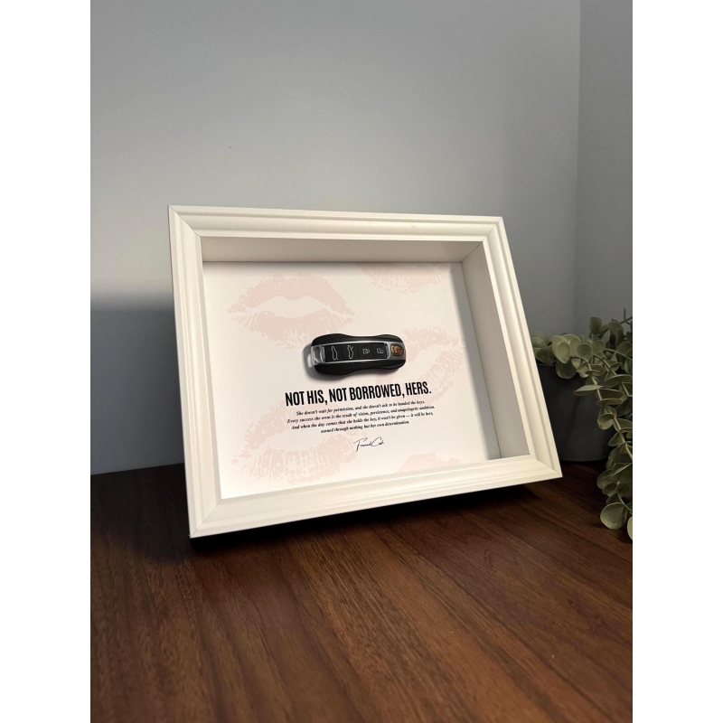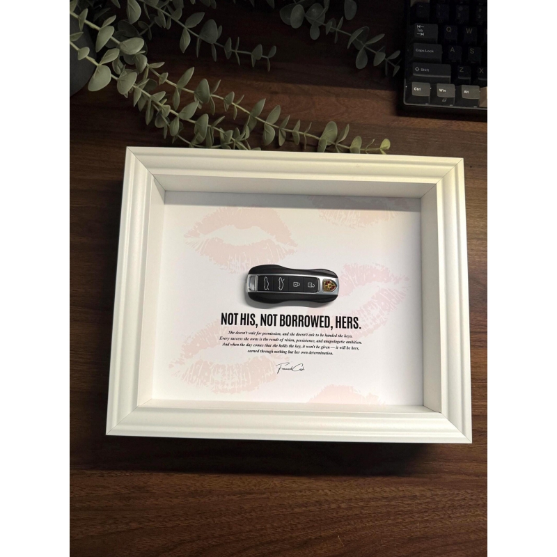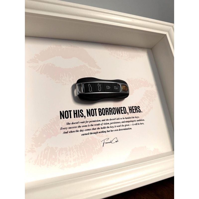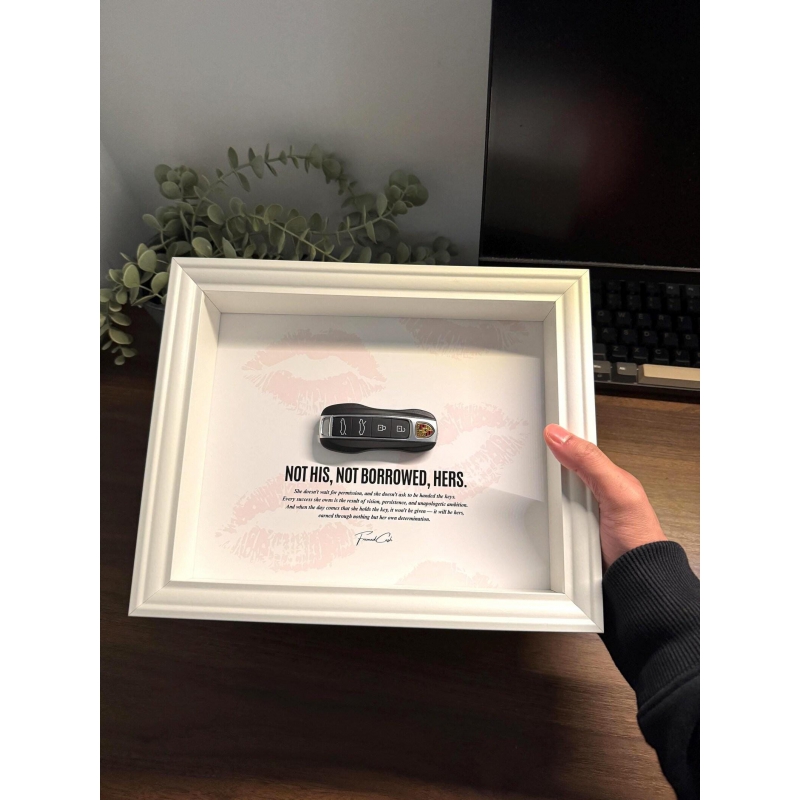 This 25x20 cm handcrafted frame by FramedCash features an authentic Porsche key mounted on a crisp white matte background, accented with soft kiss-print details. A striking reminder that independence is the ultimate luxury.