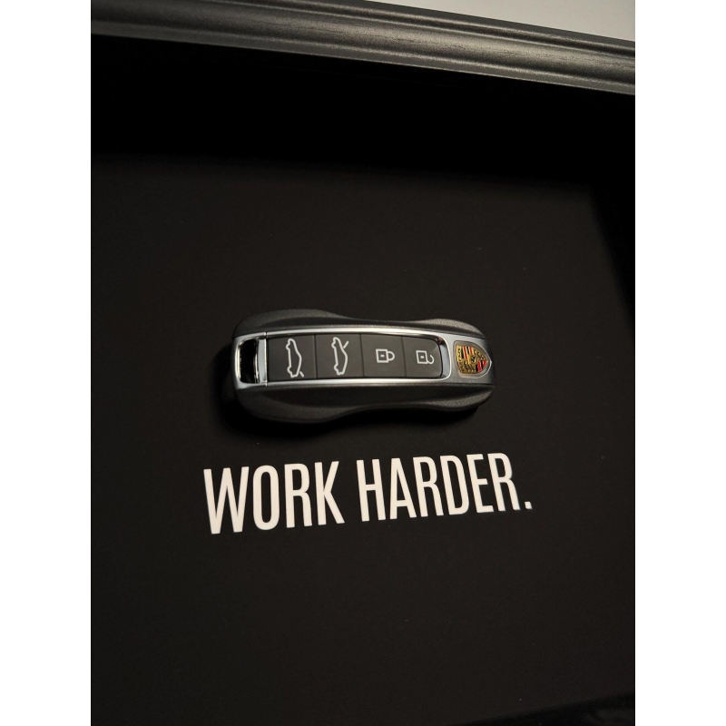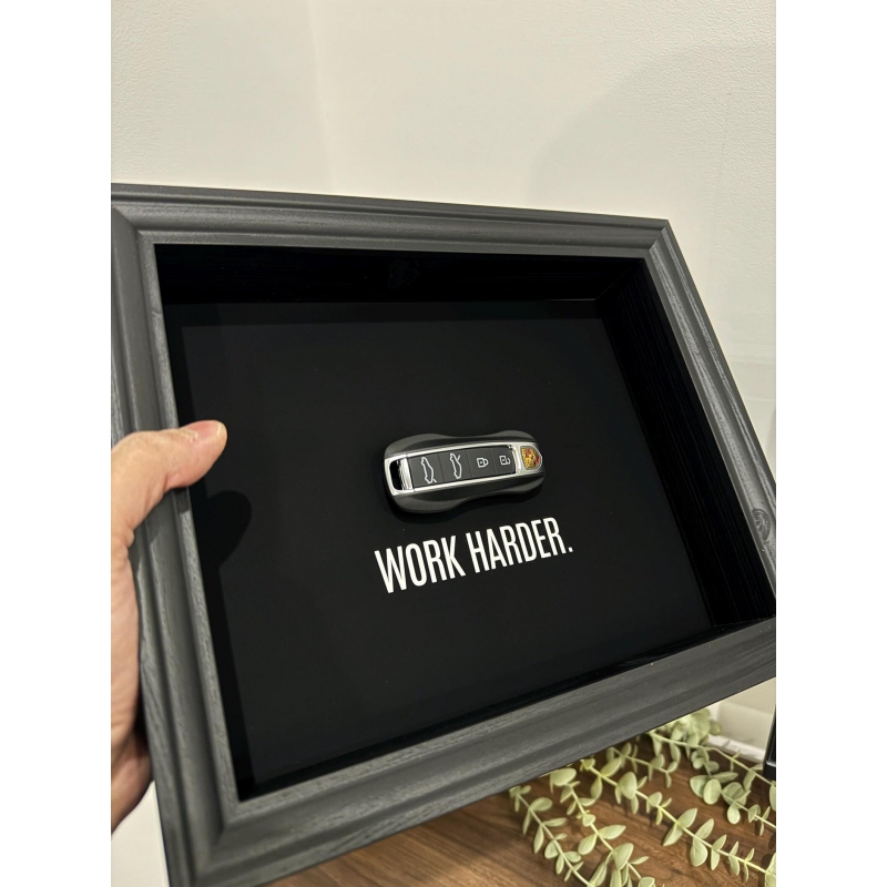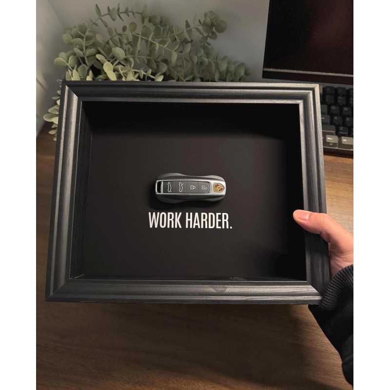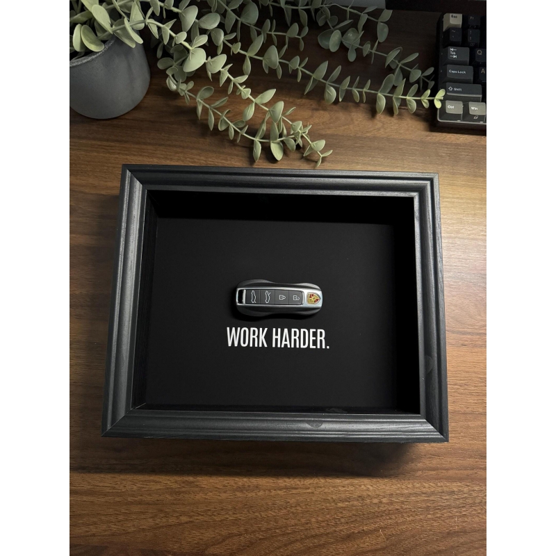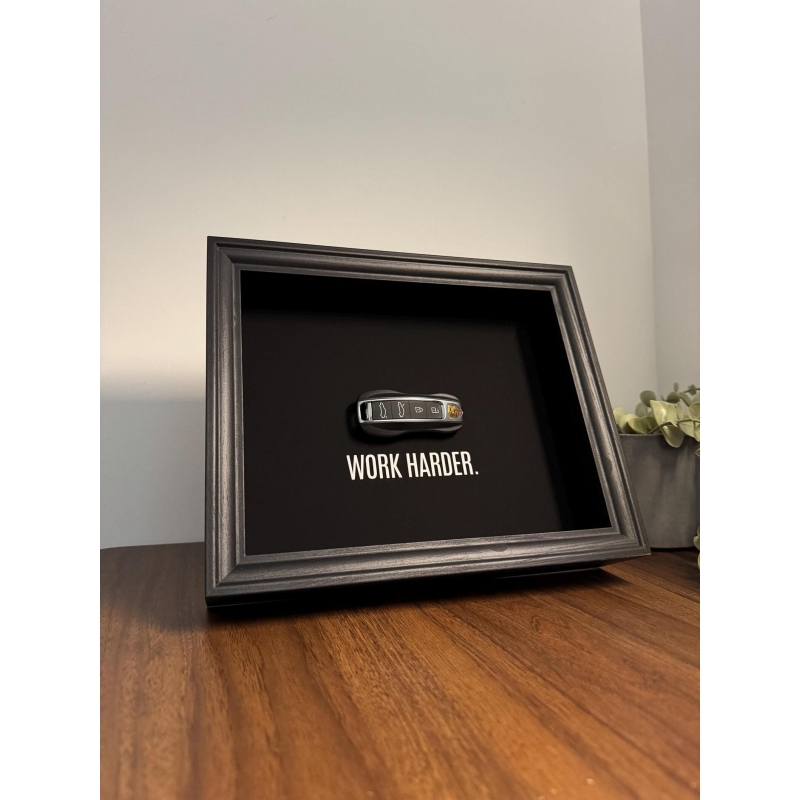 This 25x20 cm handmade frame by FramedCash features a Porsche key against a deep matte black backdrop, paired with the bold reminder that pushes you to outwork, outlast, and outfocus everyone else: Work Harder. A statement of grit and ambition for those serious about their goals.