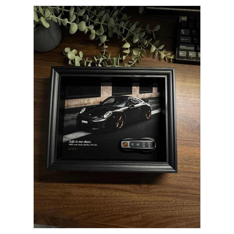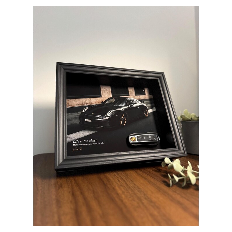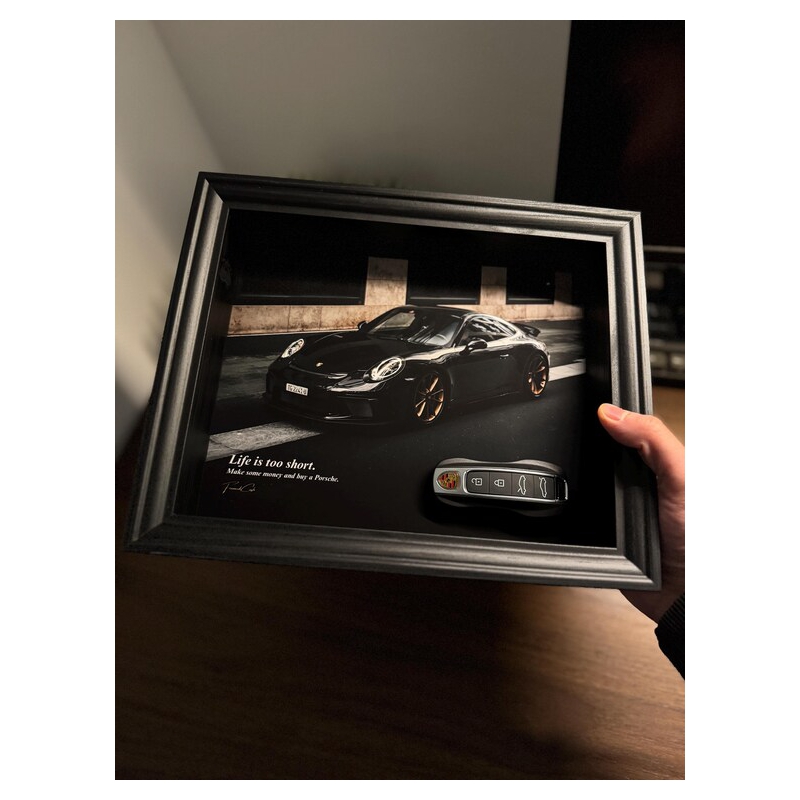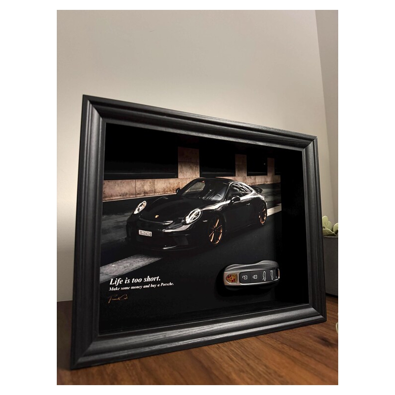This frame captures the spirit of pure ambition — the idea that life’s too short to settle for average. Featuring the iconic Porsche key set against a striking 911 visual, this piece blends motivation with automotive art. A reminder that discipline and drive eventually turn dreams into reality.