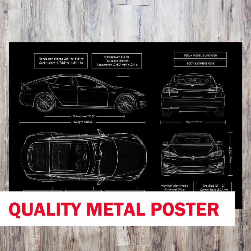 Tesla Model S 2016–2021 Blueprint Metal Poster – Luxury Electric Sedan Wall Art, Personalized Gift for Doctors, Gearheads & Entrepreneurs
