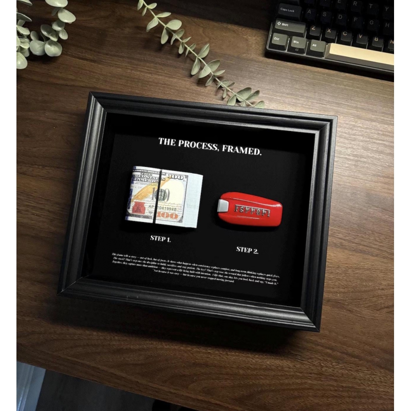 This handcrafted frame represents a mindset: delayed gratification, long-term thinking, and discipline rewarded. On the left, a clean stack of realistic dollars. On the right, a Ferrari-style key. Together, they speak one truth: