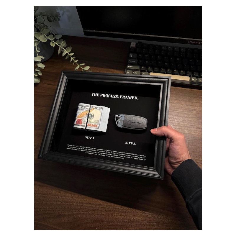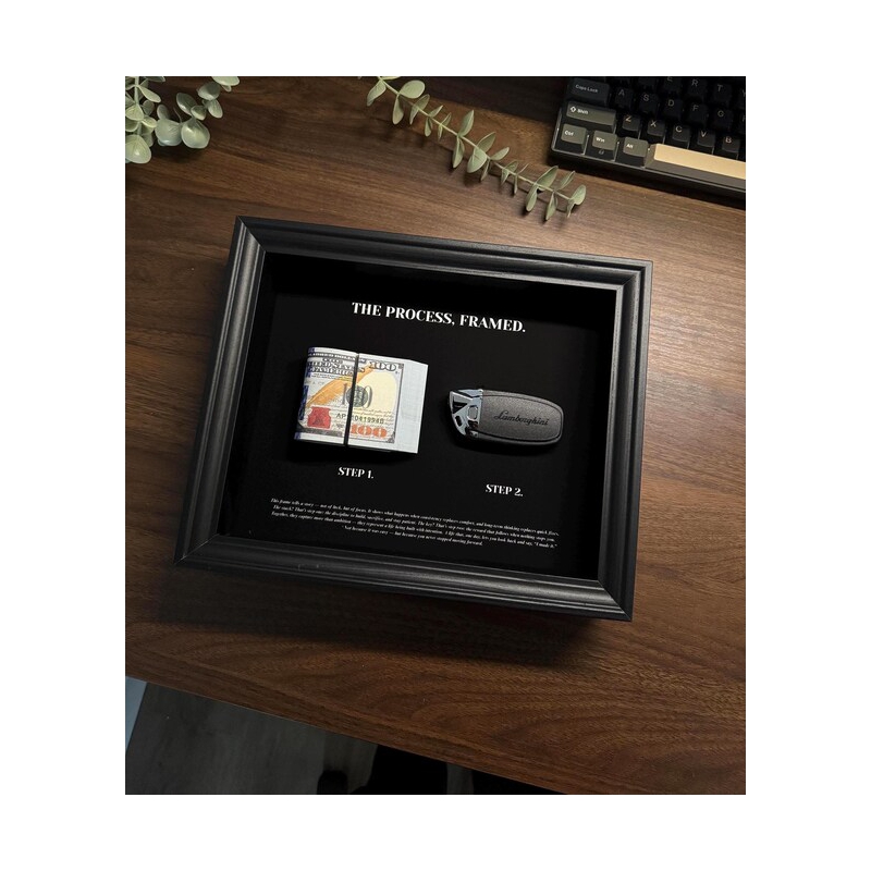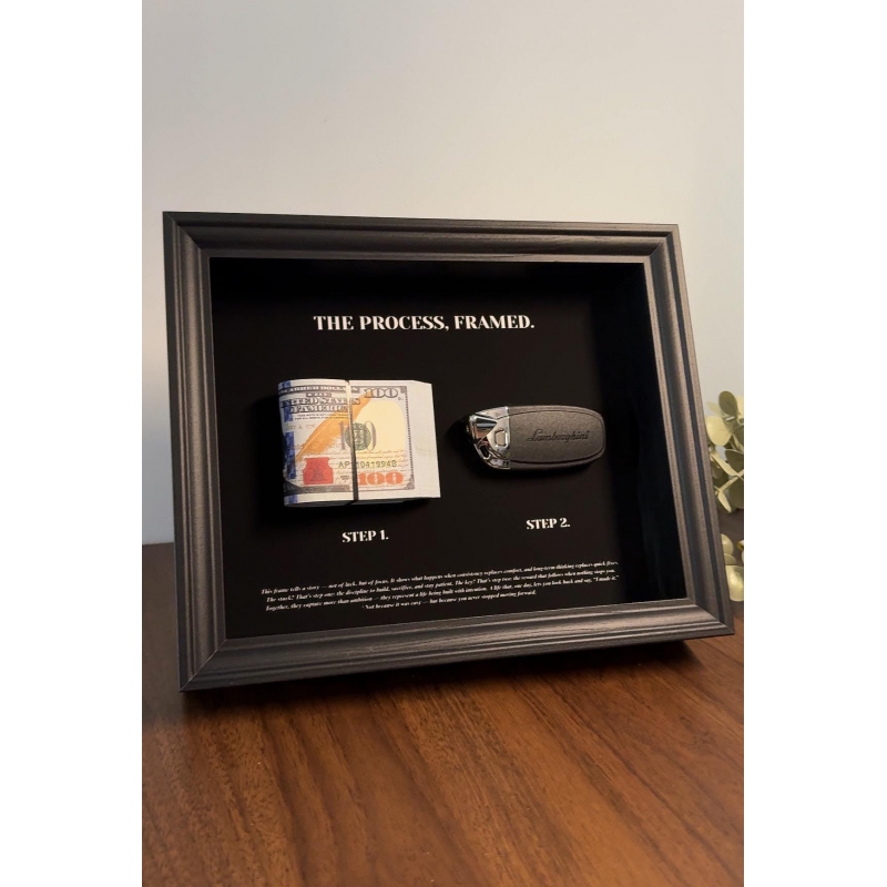 This handcrafted frame represents a mindset: delayed gratification, long-term thinking, and discipline rewarded. On the left, a clean stack of realistic dollars. On the right, a Lamborghini-style key. Together, they speak one truth: